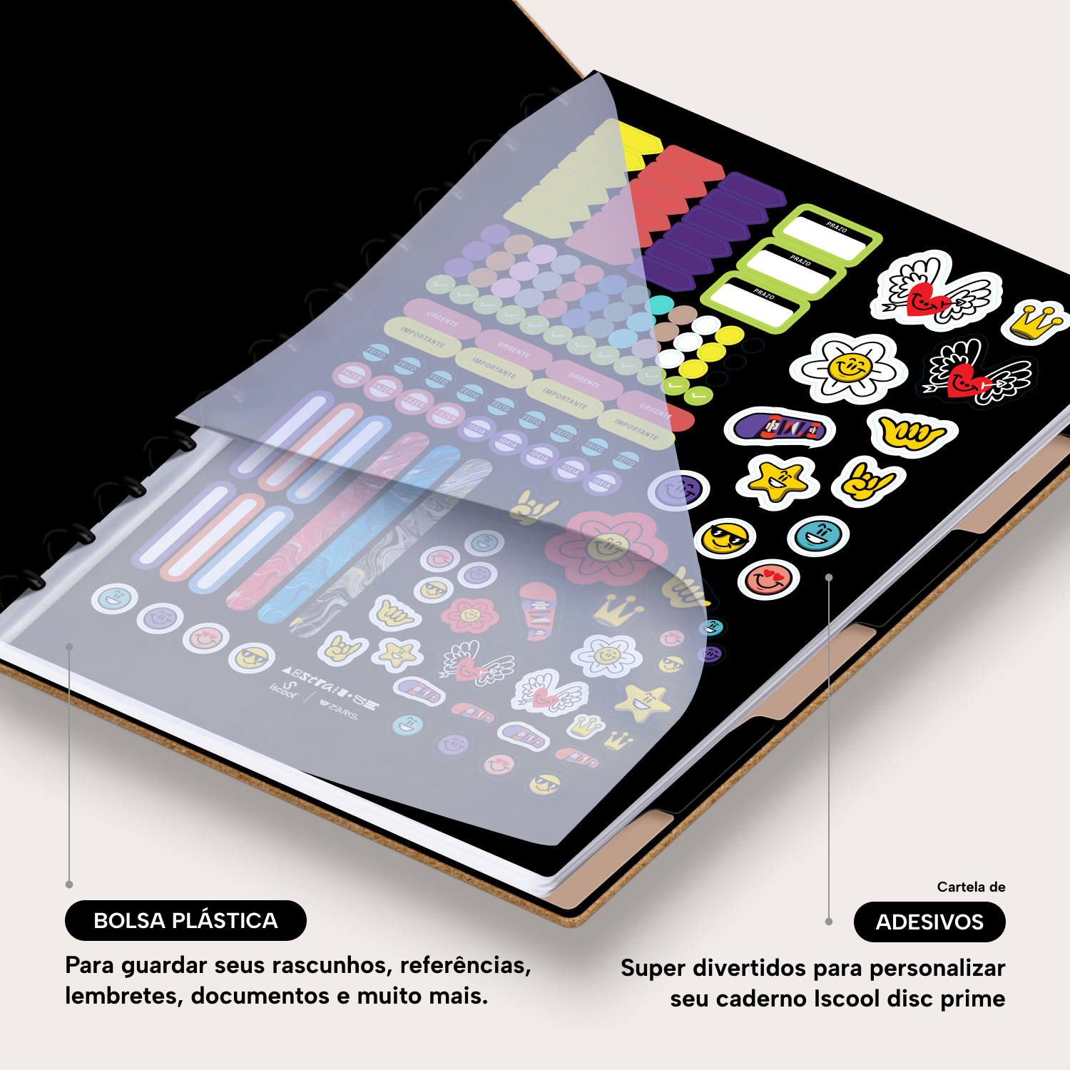 Além de tudo isso, o iscooldisc Prime conta com detalhes que fazem toda a diferença: elástico para fechamento da capa, muito mais estilo e privacidade para suas anotações; bolsa plástica para guardar seus rascunhos, referências, lembretes, documentos e uma cartela de adesivos incríveis, para que você possa personalizar seu caderno do seu jeitinho!