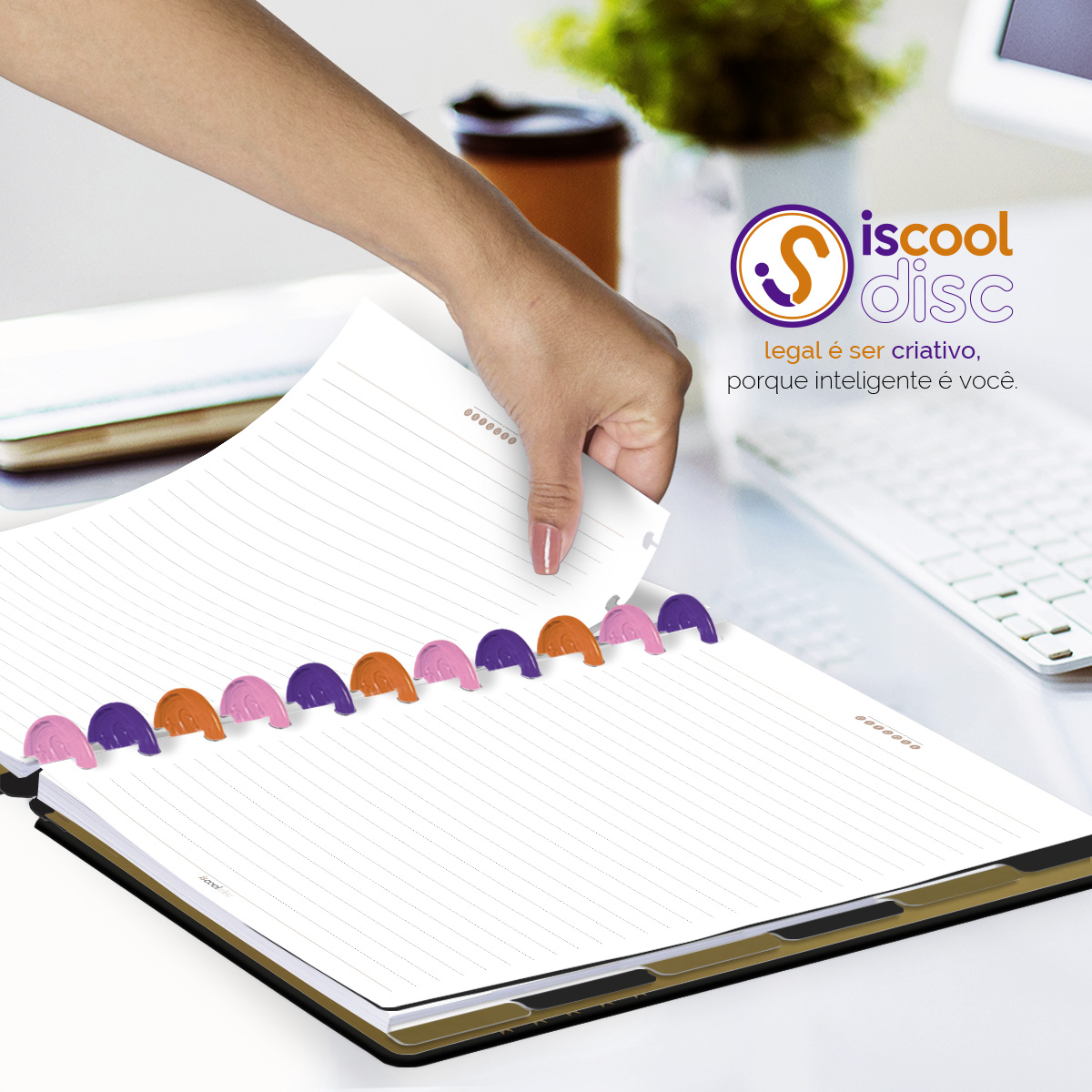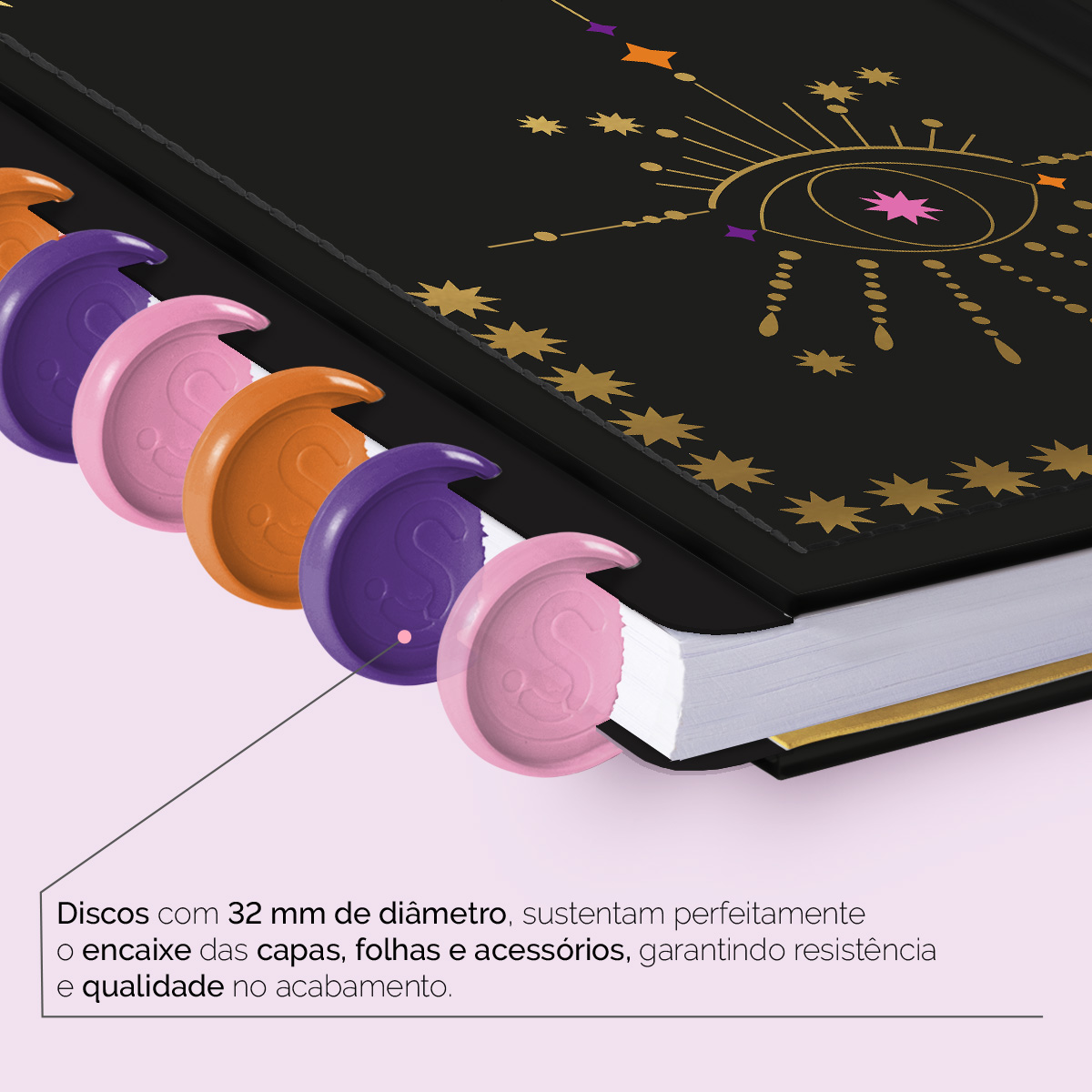 Encadernado com 11 discos M de 23mm em polímero de nylon e/ou policarbonato coloridos, fabricados no Brasil.