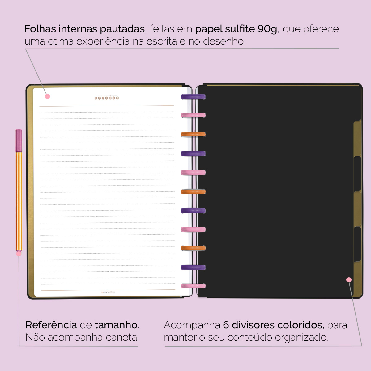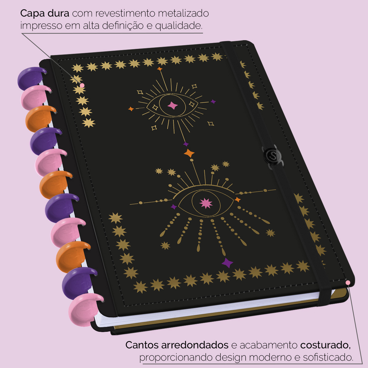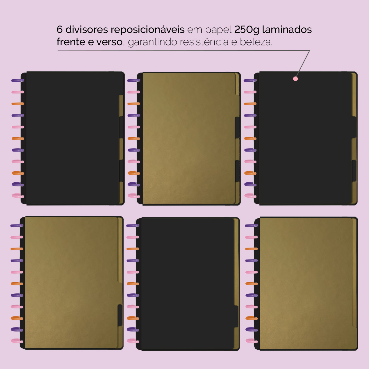 A capa é dura com impressão digital de alta definição, acompanha 6 lindas divisórias que você pode colocar em qualquer local do caderno, funcionando como o guia perfeito para sua organização.