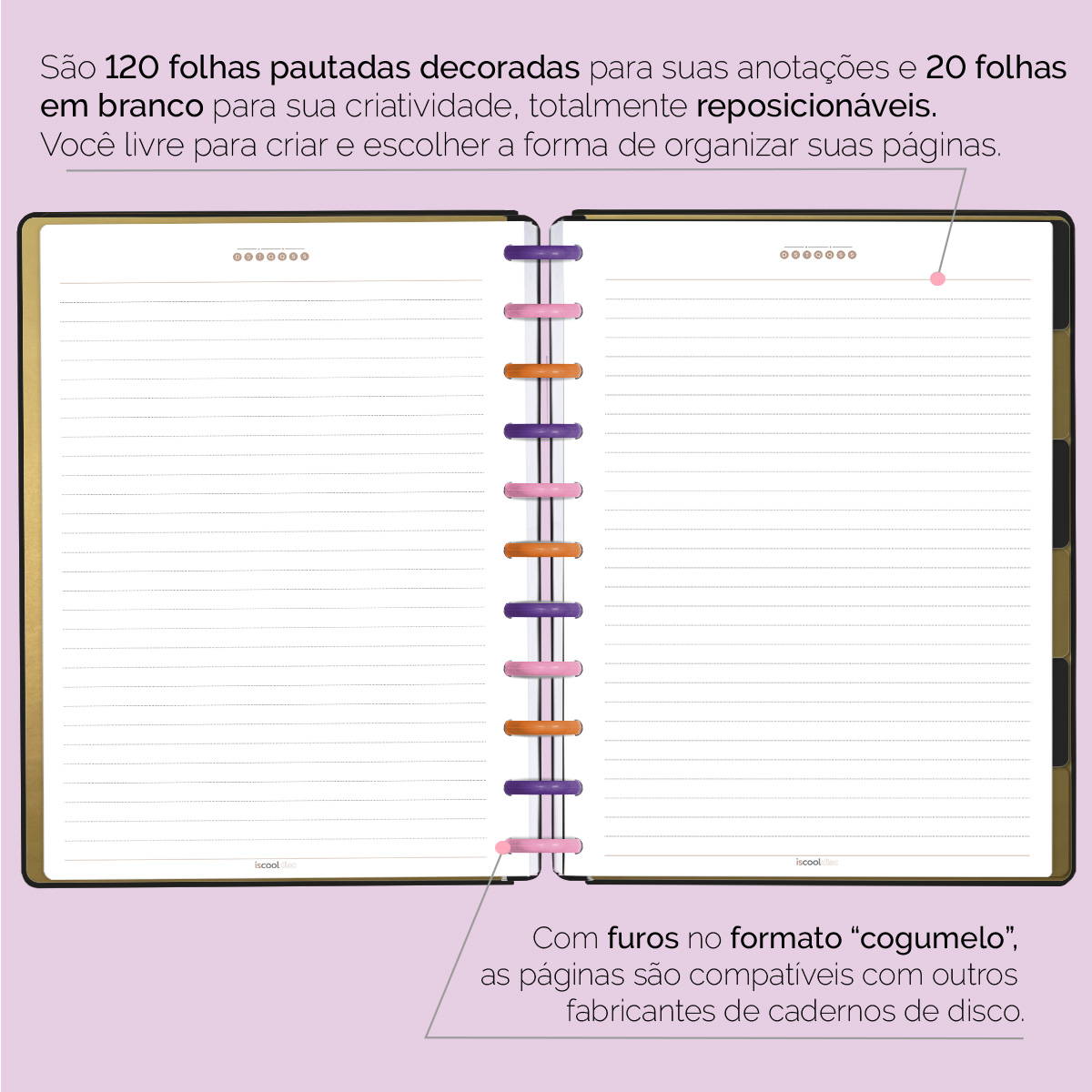 Com furos no formato de “cogumelo”, você poderá dar um “up” em seu caderno com nossos refis, além de ser compatível com outros fabricantes de cadernos de discos.