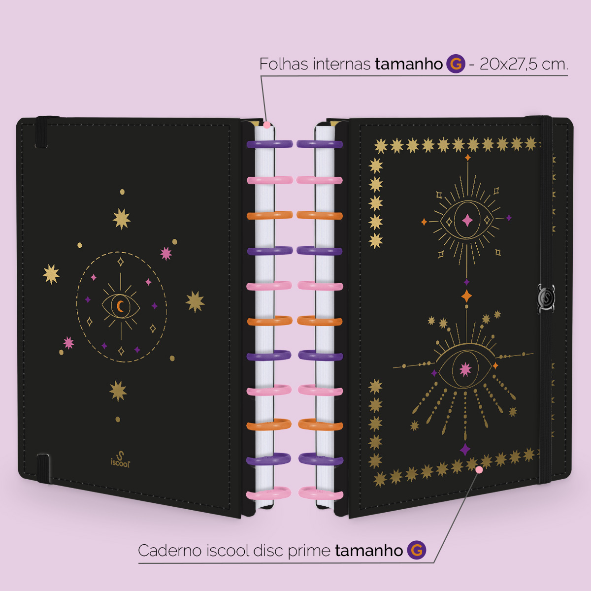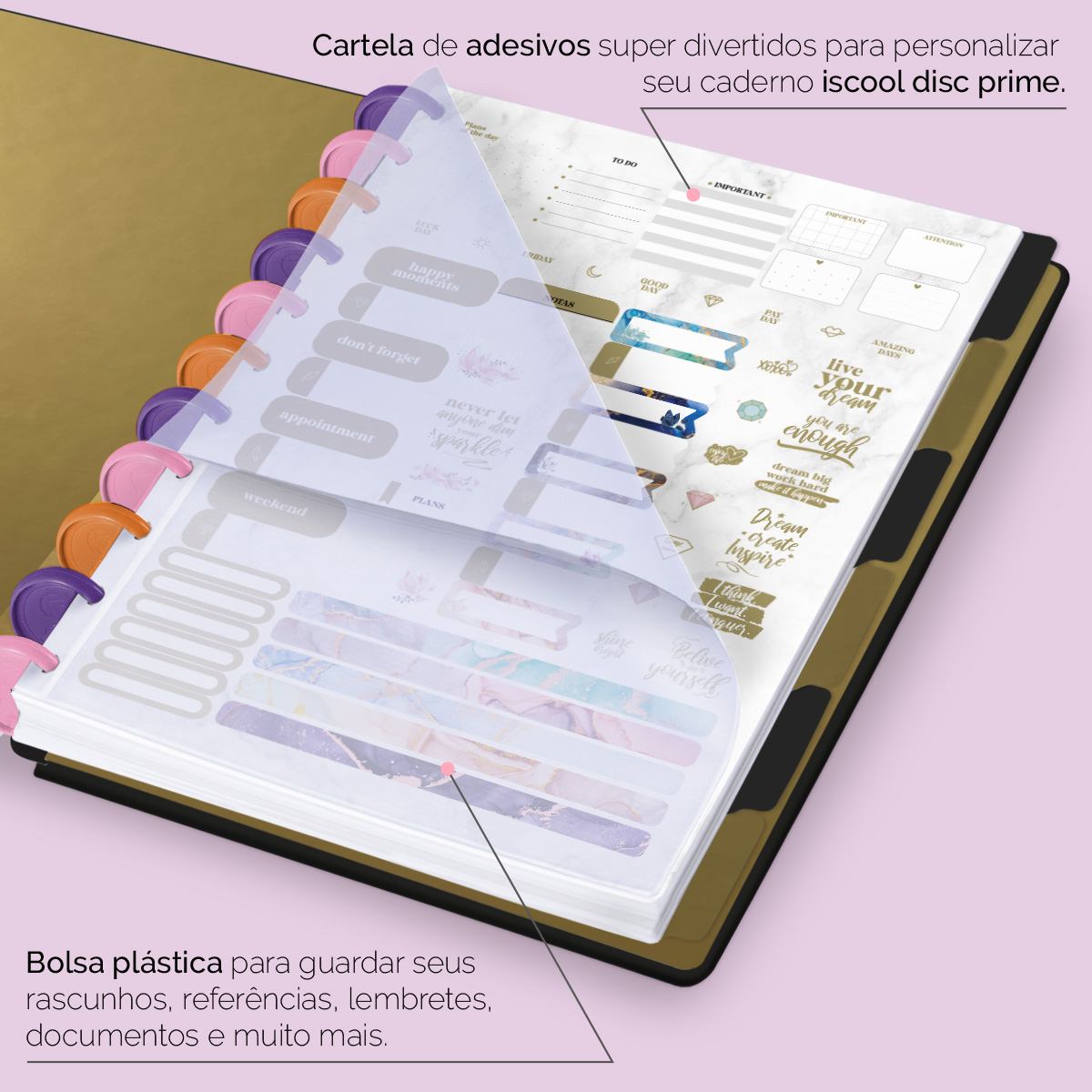 Além de tudo isso, o Iscool Disc Prime, conta com detalhezinhos que fazem toda diferença: elástico para fechamento da capa, muito mais estilo e privacidade para suas anotações; bolsa plástica para guardar seus rascunhos, referências, lembretes, documentos e uma cartela de adesivos incríveis, para que você possa personalizar seu caderno do seu jeitinho!