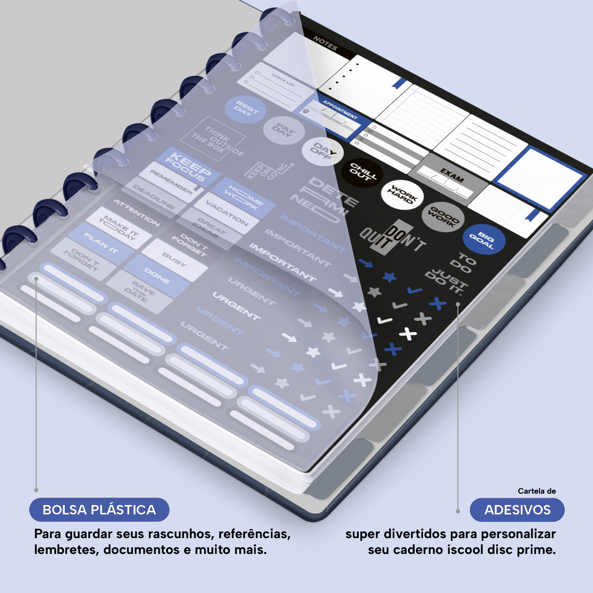 Além de tudo isso, o Iscool Disc Prime, conta com detalhezinhos que fazem toda diferença: elástico para fechamento da capa, muito mais estilo e privacidade para suas anotações; bolsa plástica para guardar seus rascunhos, referências, lembretes, documentos e uma cartela de adesivos incríveis, para que você possa personalizar seu caderno do seu jeitinho!