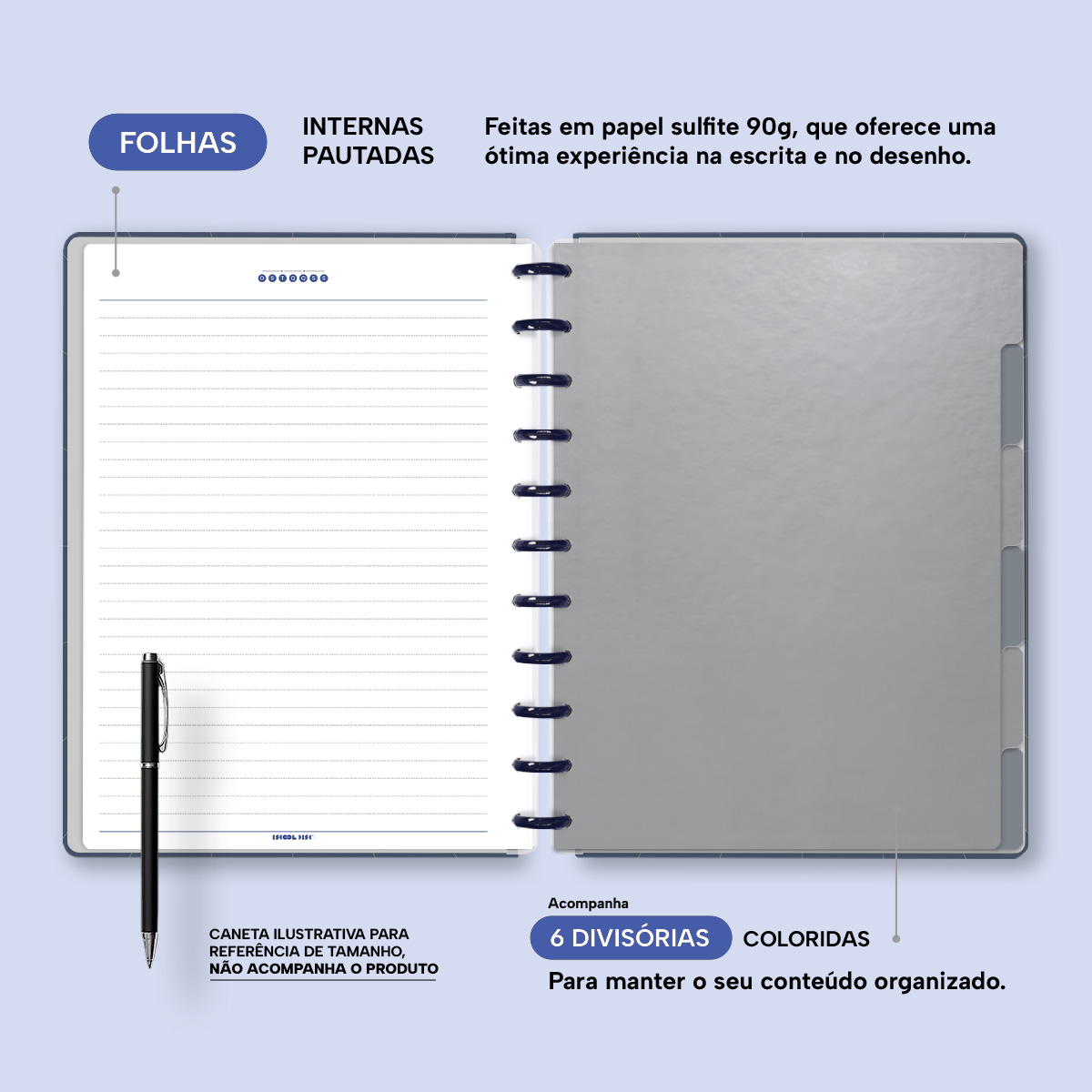 A capa é dura com impressão digital de alta definição, acompanha 6 lindas divisórias que você pode colocar em qualquer local do caderno, funcionando como o guia perfeito para sua organização.