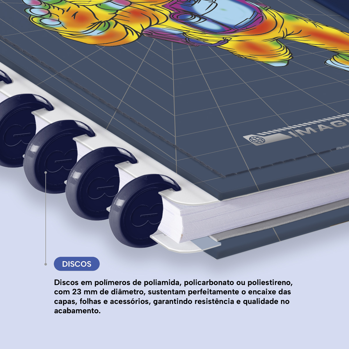 Encadernado com 11 discos M de 23mm em polímero de nylon e/ou policarbonato coloridos, fabricados no Brasil.