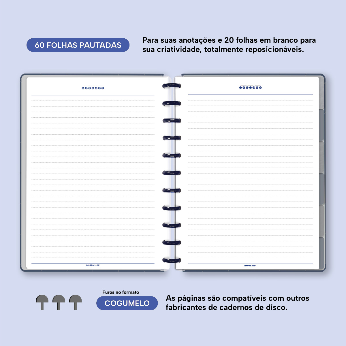 Com furos no formato de “cogumelo”, você poderá dar um “up” em seu caderno com nossos refis, além de ser compatível com outros fabricantes de cadernos de discos.