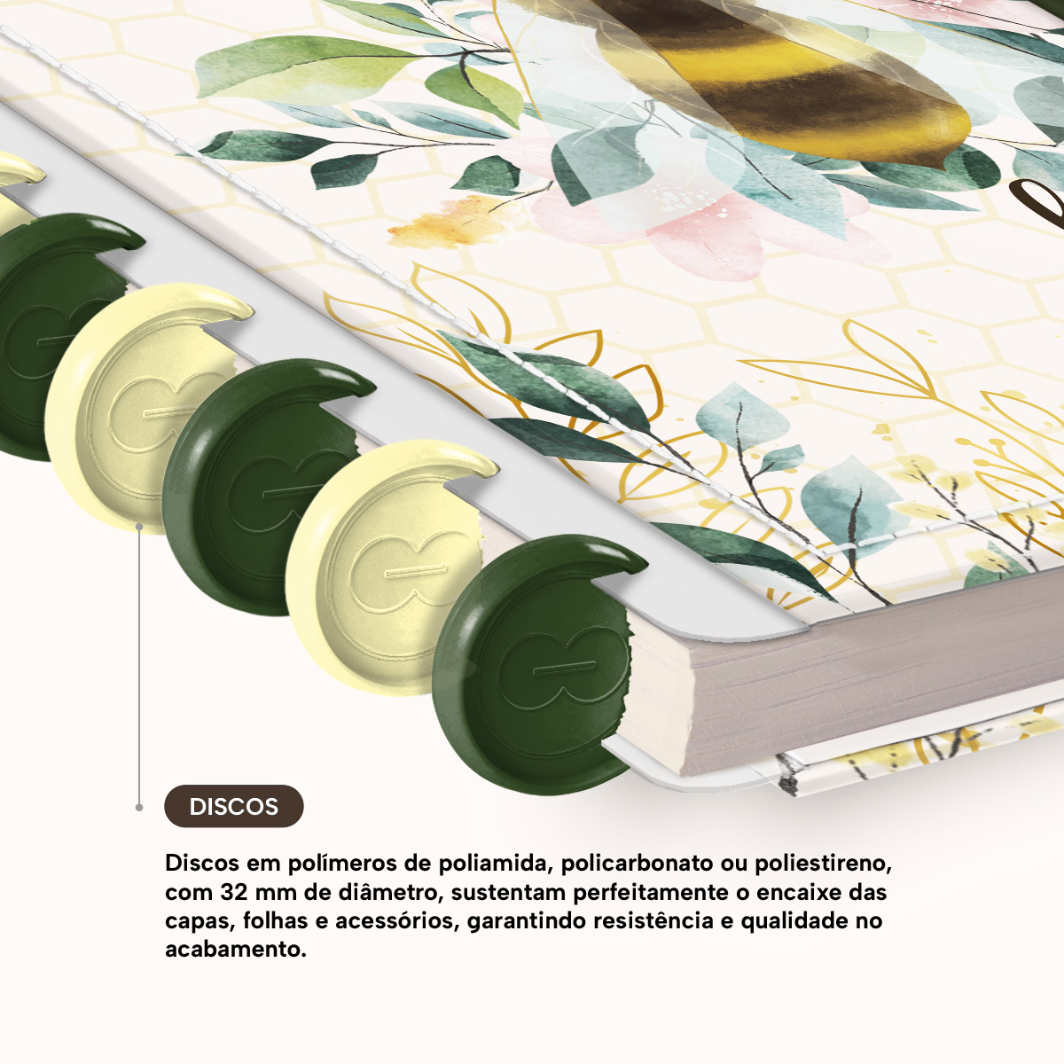 Os nossos discos são fabricados em polímero de nylon e/ou policarbonato, podem ser substituídos, proporcionando imensa variedade na combinação das cores, qualidade no acabamento e eficácia no encaixe das capas, folhas e acessórios.