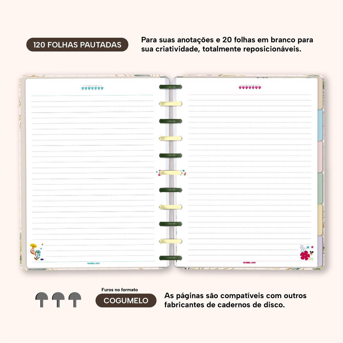 Com furos no formato de “cogumelo”, você poderá dar um “up” em seu caderno com nossos refis, além de ser compatível com outros fabricantes de cadernos de discos.