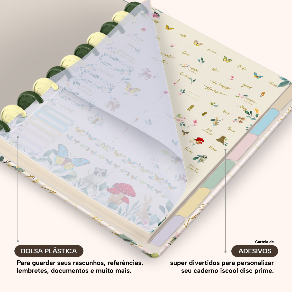 Além de tudo isso, o Iscool Disc Prime, conta com detalhezinhos que fazem toda diferença: elástico para fechamento da capa, muito mais estilo e privacidade para suas anotações; bolsa plástica para guardar seus rascunhos, referências, lembretes, documentos e uma cartela de adesivos incríveis, para que você possa personalizar seu caderno do seu jeitinho!