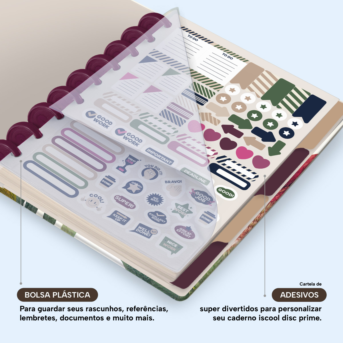 Além de tudo isso, o ISCOOL DISC PRIME UNIVERSITÁRIO, conta com detalhezinhos que fazem toda diferença: elástico para fechamento da capa, muito mais estilo e privacidade para suas anotações; bolsa plástica para guardar seus rascunhos, referências, lembretes, documentos e uma cartela de adesivos incríveis, para que você possa personalizar seu caderno do seu jeitinho!