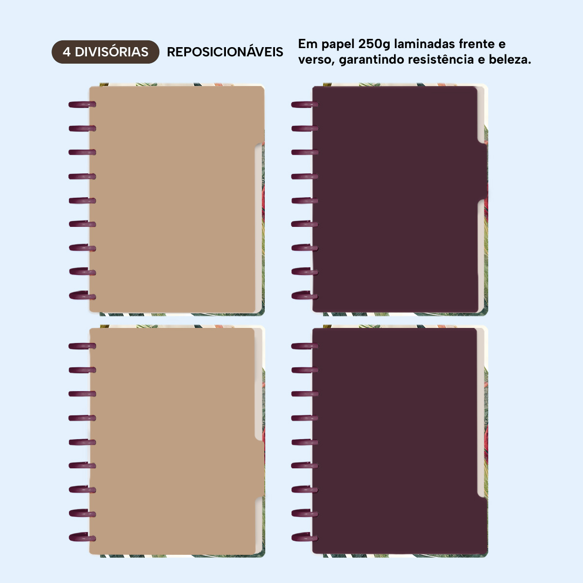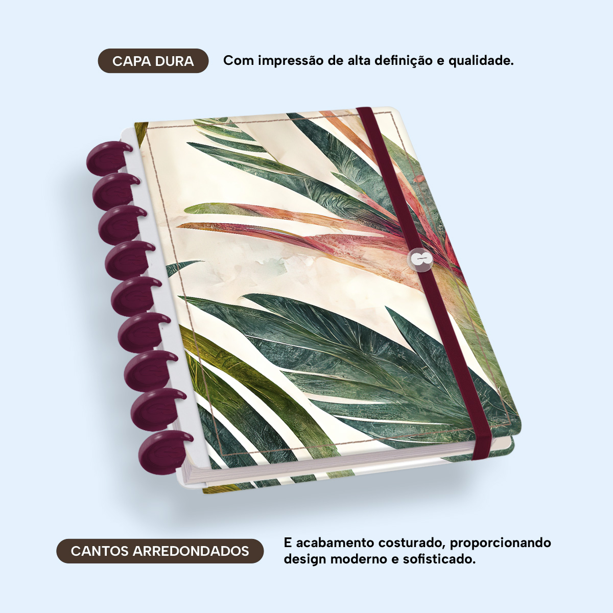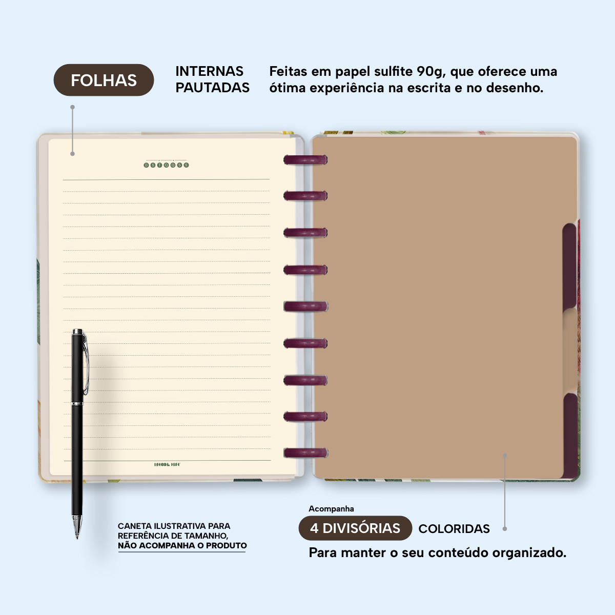 A capa é dura com impressão digital de alta definição, acompanha 6 lindas divisórias que você pode colocar em qualquer local do caderno, funcionando como o guia perfeito para sua organização.