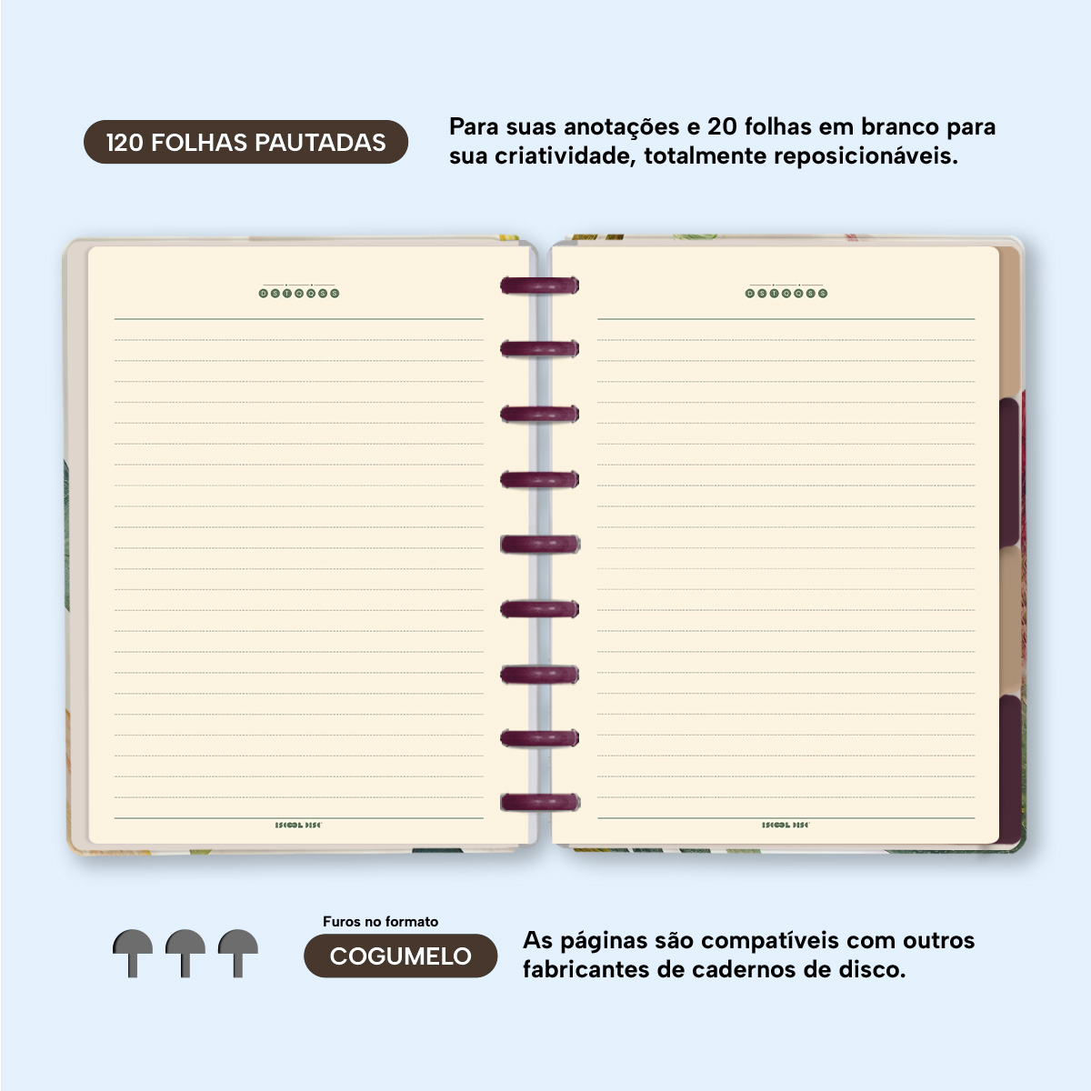 Com furos no formato de “cogumelo”, você poderá dar um “up” em seu caderno com nossos refis, além de ser compatível com outros fabricantes de cadernos de discos.