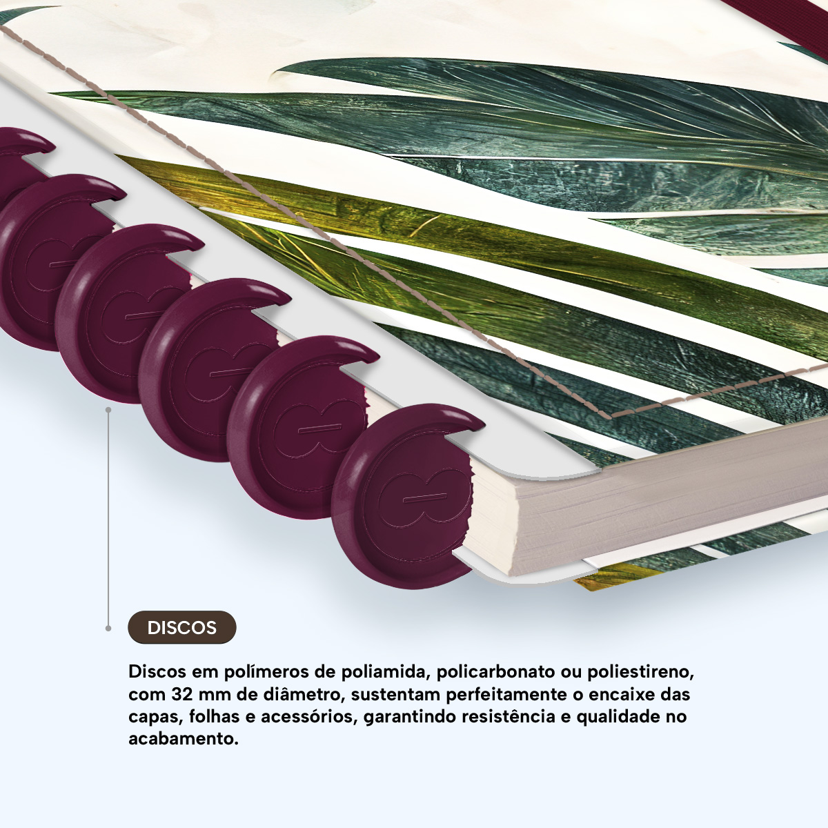 Os nossos discos são fabricados em polímero de nylon e/ou policarbonato, podem ser substituídos, proporcionando imensa variedade na combinação das cores, qualidade no acabamento e eficácia no encaixe das capas, folhas e acessórios.