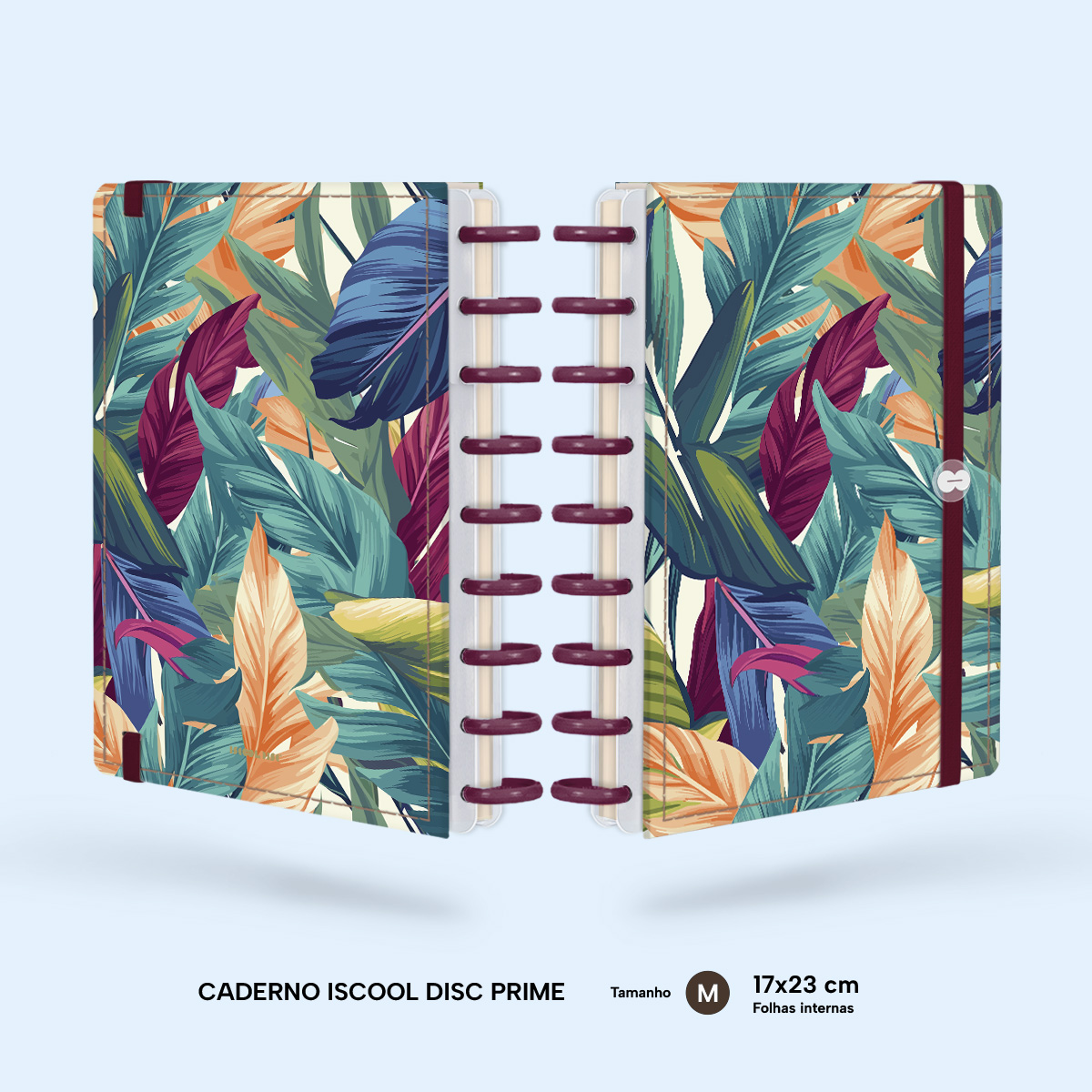 Encadernado com 11 discos M de 23mm em polímero de nylon e/ou policarbonato coloridos, fabricados no Brasil.