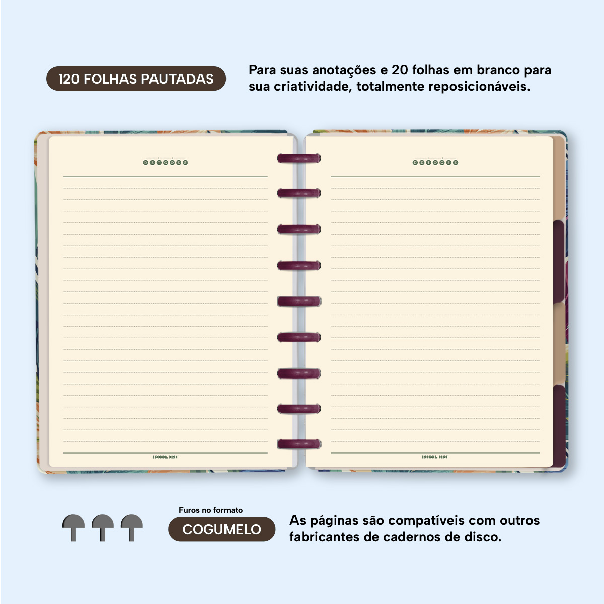 Com furos no formato de “cogumelo”, você poderá dar um “up” em seu caderno com nossos refis, além de ser compatível com outros fabricantes de cadernos de discos.