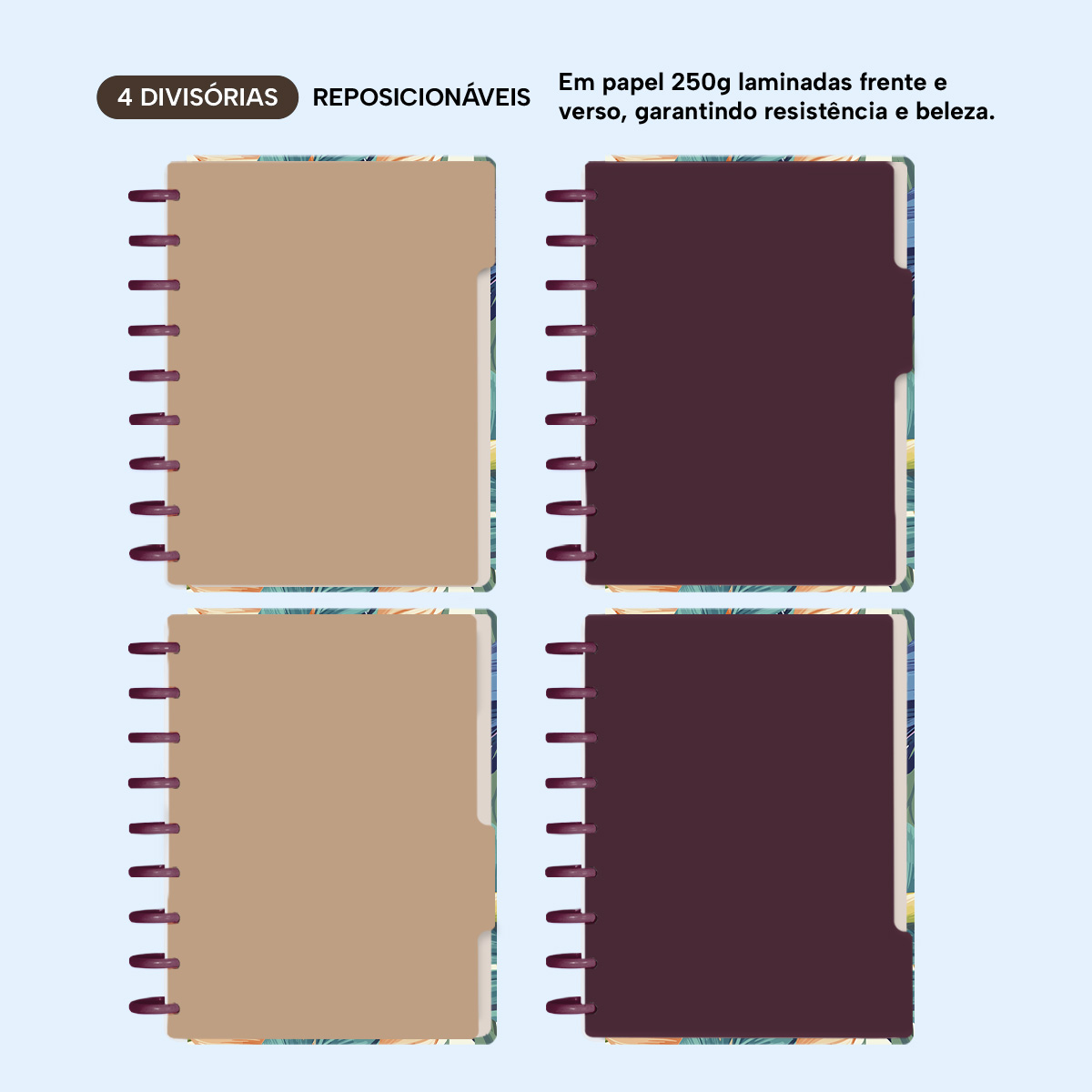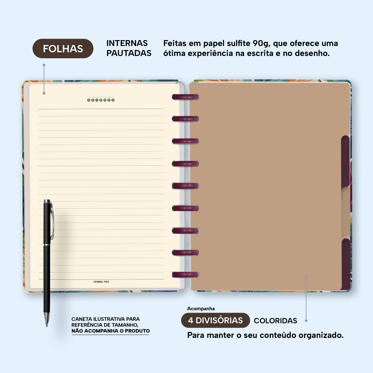 A capa é dura com impressão digital de alta definição, acompanha 6 lindas divisórias que você pode colocar em qualquer local do caderno, funcionando como o guia perfeito para sua organização.