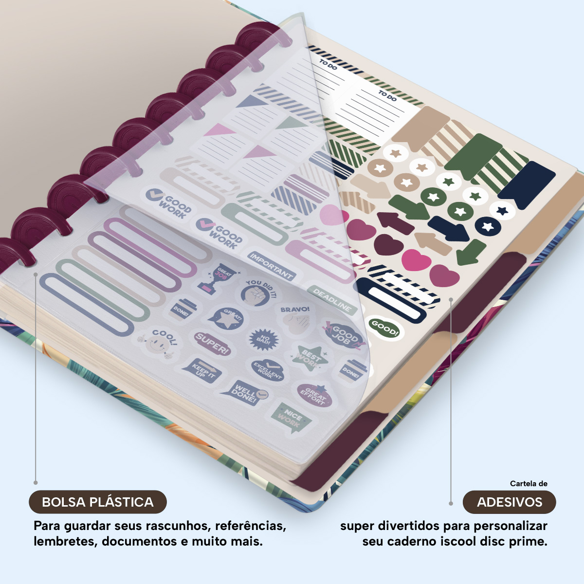 Além de tudo isso, o Iscool Disc Prime, conta com detalhezinhos que fazem toda diferença: elástico para fechamento da capa, muito mais estilo e privacidade para suas anotações; bolsa plástica para guardar seus rascunhos, referências, lembretes, documentos e uma cartela de adesivos incríveis, para que você possa personalizar seu caderno do seu jeitinho!