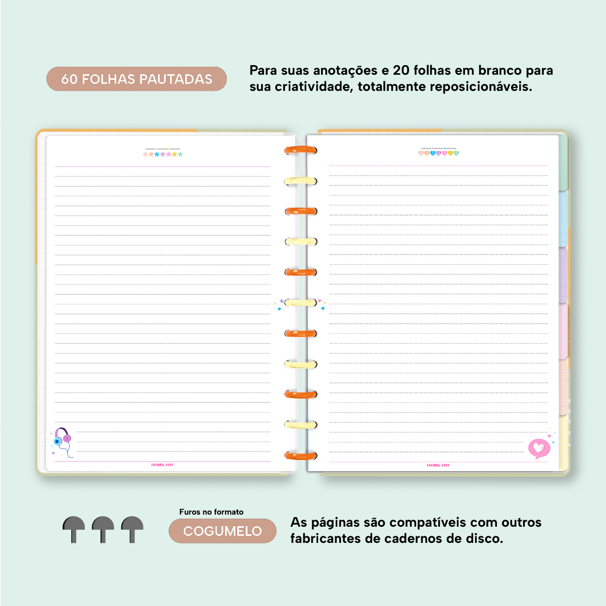 Com furos no formato de “cogumelo”, você poderá dar um “up” em seu caderno com nossos refis, além de ser compatível com outros fabricantes de cadernos de discos.