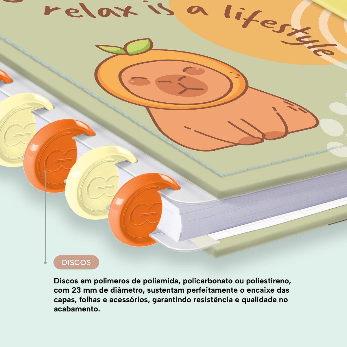 Encadernado com 11 discos M de 23mm em polímero de nylon e/ou policarbonato coloridos, fabricados no Brasil.