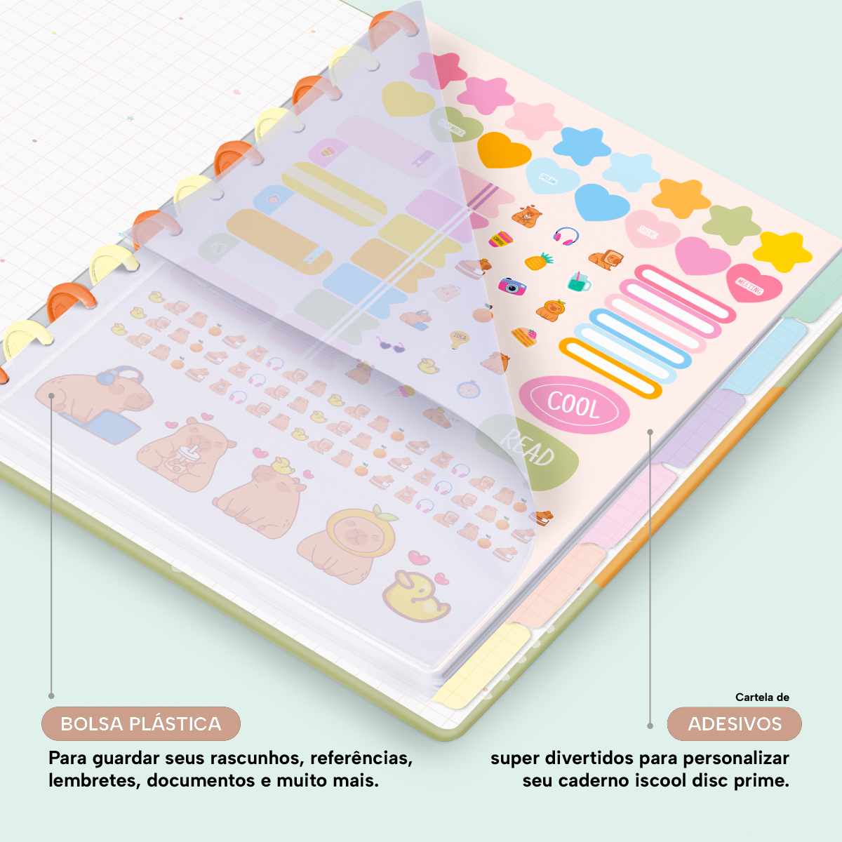 Além de tudo isso, o Iscool Disc Prime, conta com detalhezinhos que fazem toda diferença: elástico para fechamento da capa, muito mais estilo e privacidade para suas anotações; bolsa plástica para guardar seus rascunhos, referências, lembretes, documentos e uma cartela de adesivos incríveis, para que você possa personalizar seu caderno do seu jeitinho!