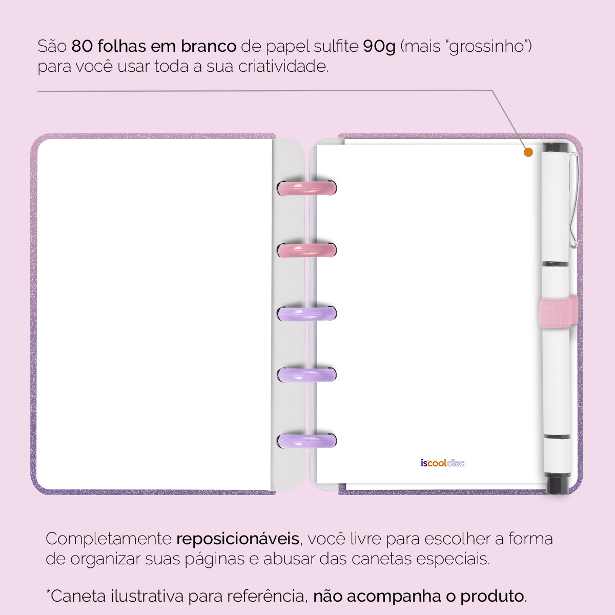 Um caderno totalmente customizável, no qual os elementos são reposicionáveis. Você pode montá-lo como preferir, deixando rolar solta toda sua criatividade.