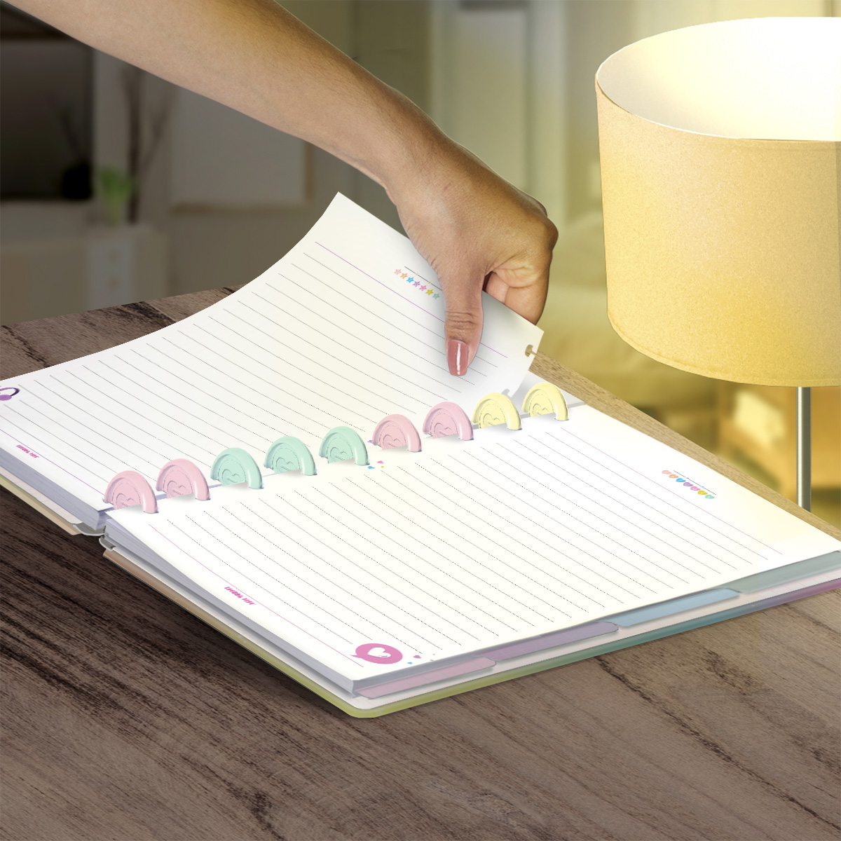 Com furos no formato de “cogumelo”, você poderá dar um “up” em seu caderno com nossos refis, além de ser compatível com outros fabricantes de cadernos de discos.