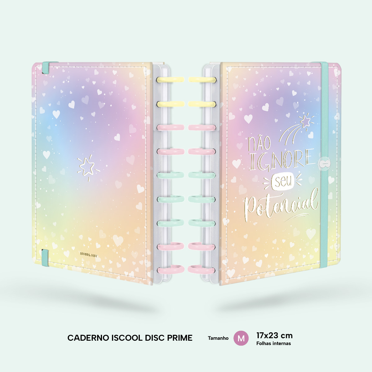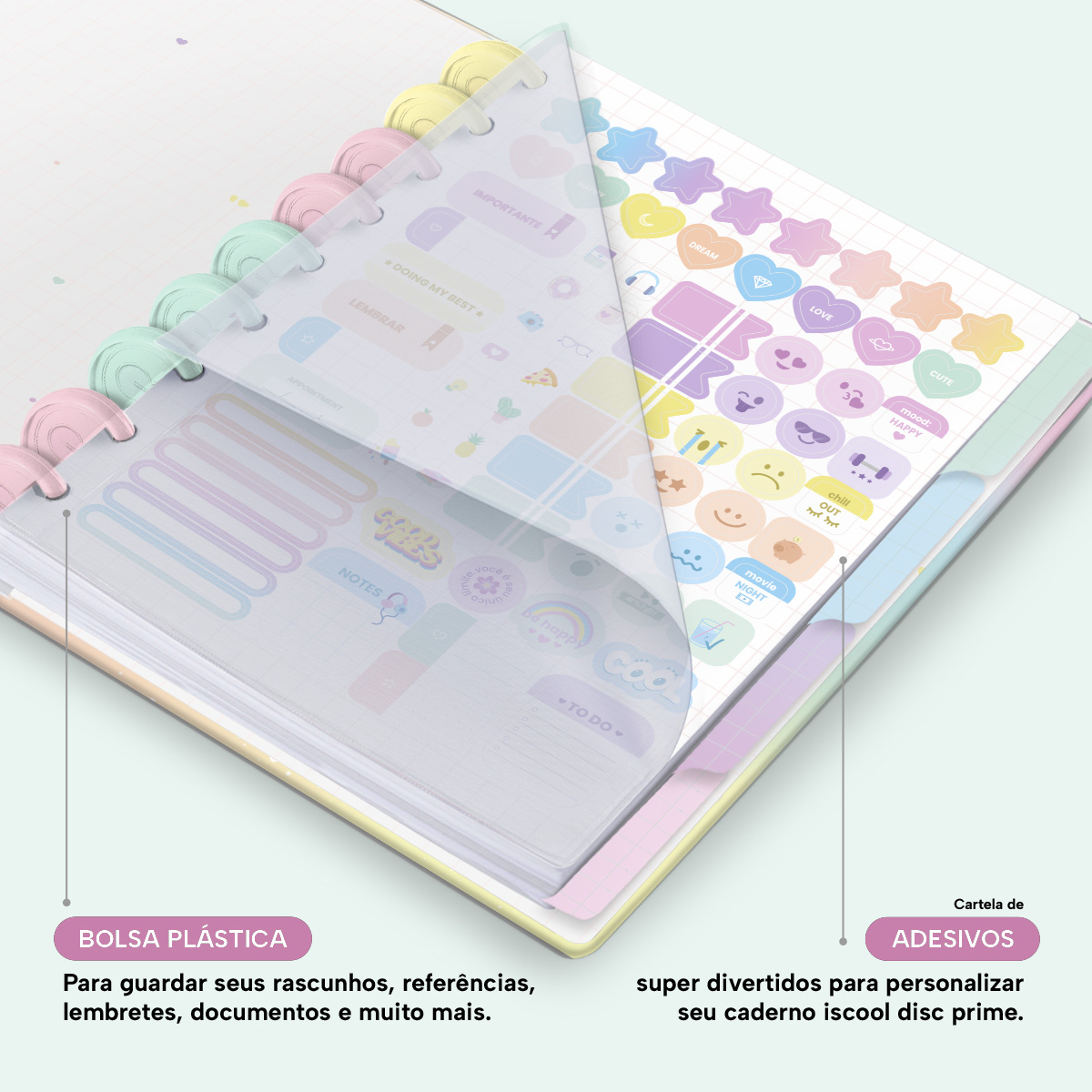 Além de tudo isso, o ISCOOL DISC PRIME UNIVERSITÁRIO, conta com detalhezinhos que fazem toda diferença: elástico para fechamento da capa, muito mais estilo e privacidade para suas anotações; bolsa plástica para guardar seus rascunhos, referências, lembretes, documentos e uma cartela de adesivos incríveis, para que você possa personalizar seu caderno do seu jeitinho!