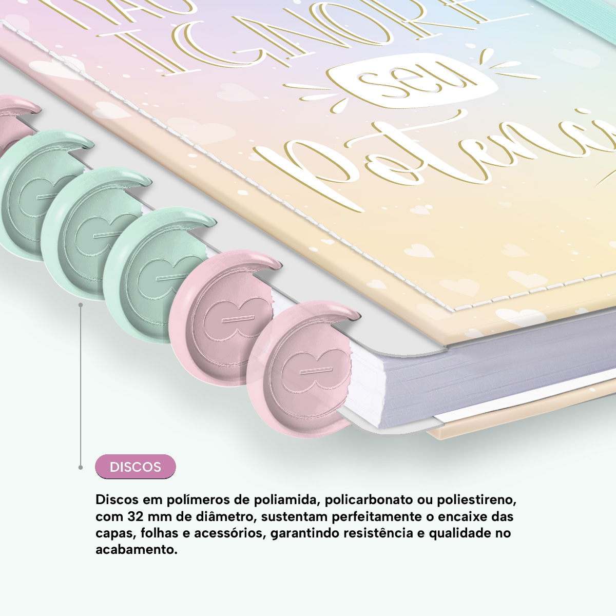 Encadernado com 11 discos G de 32mm em polímero de nylon e/ou policarbonato coloridos, fabricados no Brasil.