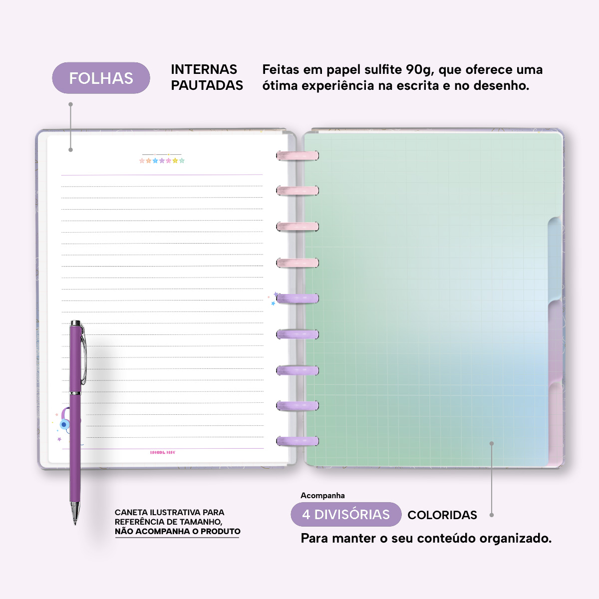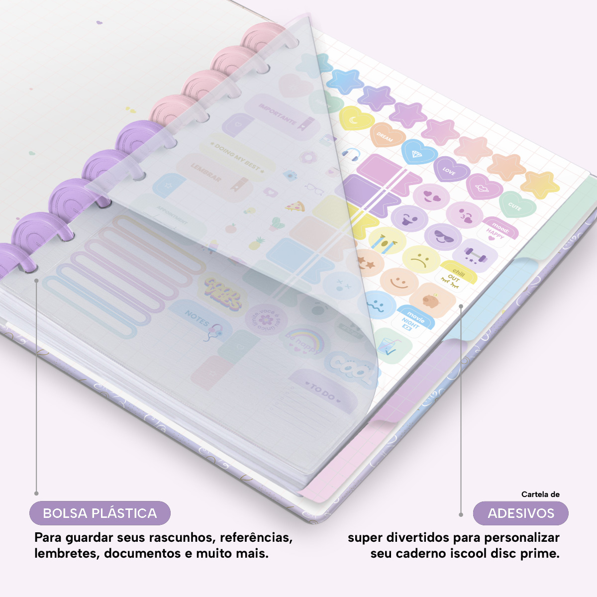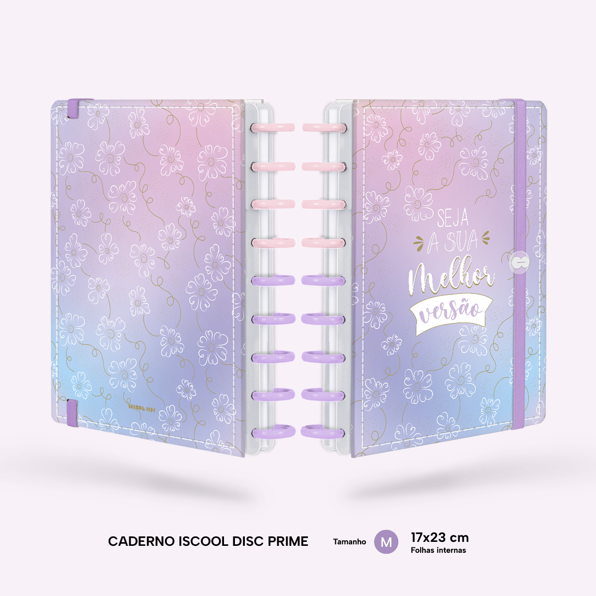 Tamanho da capa: 20,5 cm de largura por 28,5 cm de comprimento. Tamanho das folhas: 20 cm de largura por 27,5 cm de comprimento. Tamanho dos divisores: 21 cm de largura por 27,5 cm de comprimento.   Capa dura com impressão digital de alta definição. Elástico para fechamento da capa do caderno. Bolsa plástica para guardar documentos e anotações. Página com instruções de como utilizar seu caderno. Cartela de adesivos divertidos. Encadernado com 11 discos G de 32mm em polímero de nylon e/ou policarbonato coloridos, fabricados no Brasil. 6 divisores laminados (frente e verso) em papel 250g. Quantidade de folhas: 140 folhas, sendo 120 folhas pautadas decoradas e 20 folhas em branco. Quantidade de páginas: 280 páginas. Páginas internas em papel sulfite (offset) 90g branco.   ISCOOL DISC PRIME é a escolha perfeita para quem busca um modelo moderno, criativo, prático, versátil e original, com qualidade e ótimo custo-benefício. Um caderno totalmente customizável, no qual os elementos são reposicionáveis. Você pode montá-lo como preferir, deixando rolar solta toda sua criatividade. A capa é dura com impressão digital de alta definição, acompanha 6 lindas divisórias que você pode colocar em qualquer local do caderno, funcionando como o guia perfeito para sua organização. O miolo conta com 120 folhas pautadas decoradas em papel sulfite 90g, (aquele papel mais “grossinho”) para que você use e abuse das suas canetas especiais e 20 folhas em branco, ideais para explorar seu lado mais criativo ou até imprimir nelas. Com furos no formato de “cogumelo”, você poderá dar um “up” em seu caderno com nossos refis, além de ser compatível com outros fabricantes de cadernos de discos. Os nossos discos são fabricados em polímero de nylon e/ou policarbonato, podem ser substituídos, proporcionando imensa variedade na combinação das cores, qualidade no acabamento e eficácia no encaixe das capas, folhas e acessórios. Além de tudo isso, o ISCOOL DISC PRIME UNIVERSITÁRIO, conta com detalhezinhos que fazem toda diferença: elástico para fechamento da capa, muito mais estilo e privacidade para suas anotações; bolsa plástica para guardar seus rascunhos, referências, lembretes, documentos e uma cartela de adesivos incríveis, para que você possa personalizar seu caderno do seu jeitinho!   Afinal, com o ISCOOL DISC PRIME, o legal é ser criativo, porque inteligente é você!   Produzimos cadernos, agendas e produtos de papelaria há mais de 28 anos! Garantimos a qualidade e a excelência do seu produto.