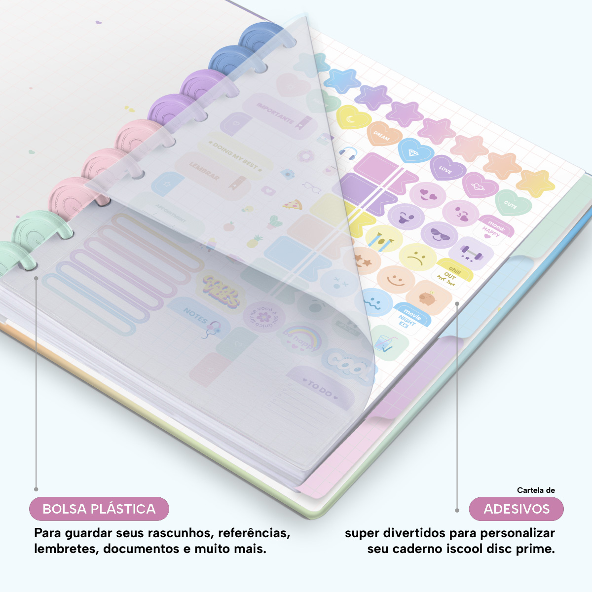 Além de tudo isso, o ISCOOL DISC PRIME UNIVERSITÁRIO, conta com detalhezinhos que fazem toda diferença: elástico para fechamento da capa, muito mais estilo e privacidade para suas anotações; bolsa plástica para guardar seus rascunhos, referências, lembretes, documentos e uma cartela de adesivos incríveis, para que você possa personalizar seu caderno do seu jeitinho!