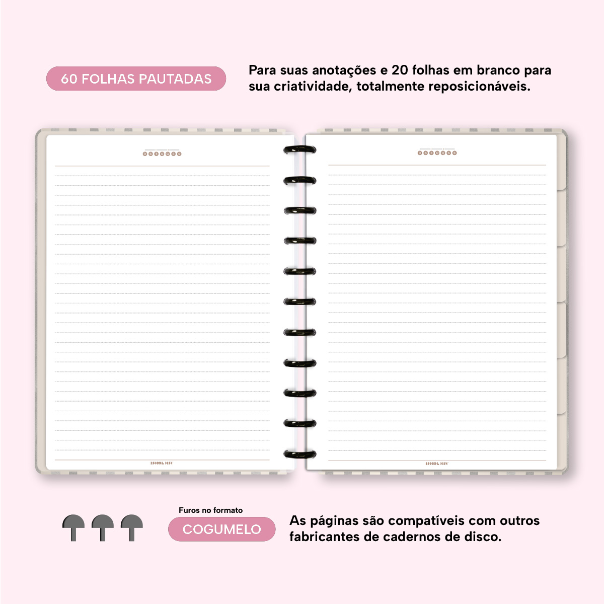 O miolo conta com 60 folhas pautadas decoradas em papel sulfite 90g, (aquele papel mais “grossinho”) para que você use e abuse das suas canetas especiais e 20 folhas em branco, ideais para explorar seu lado mais criativo ou até imprimir nelas.