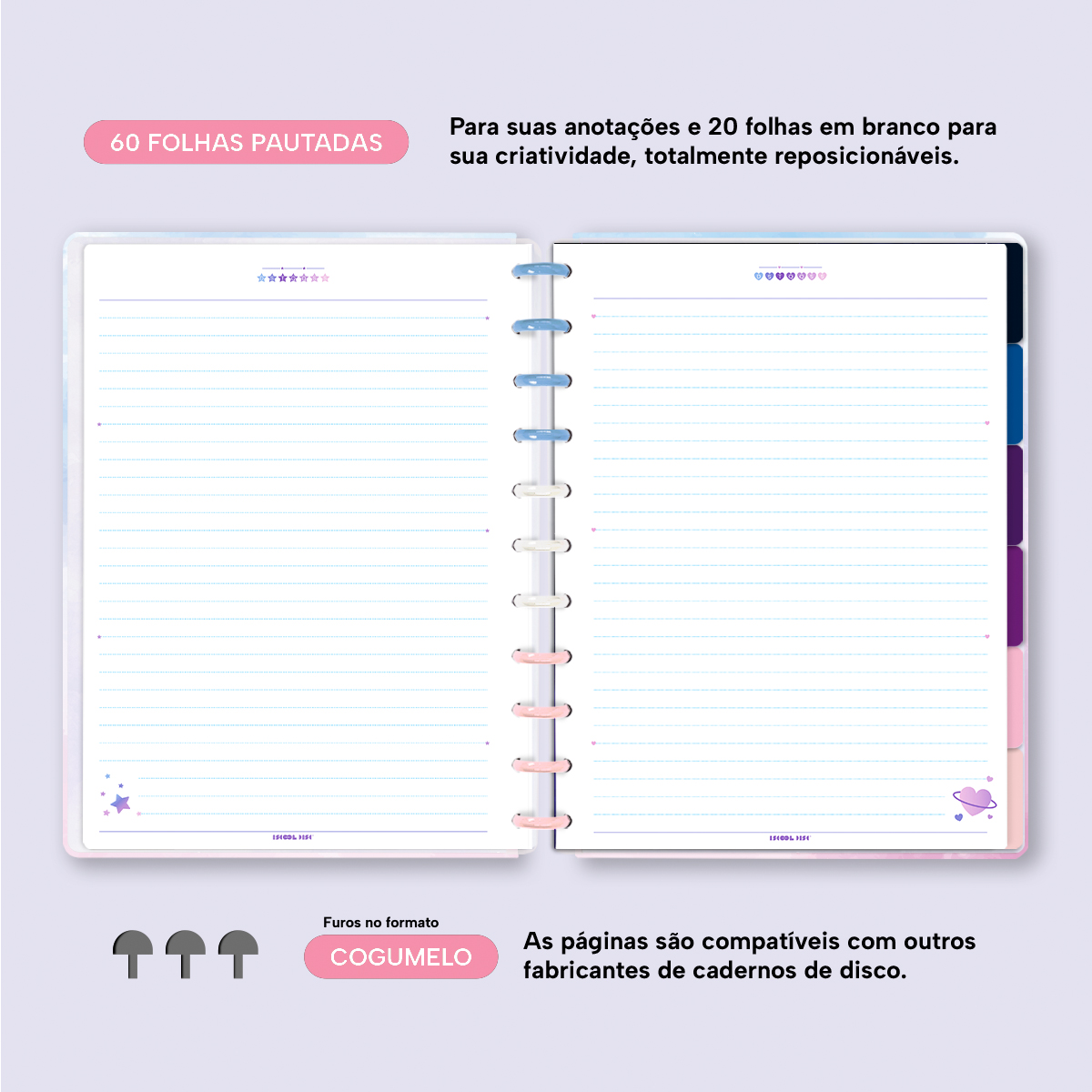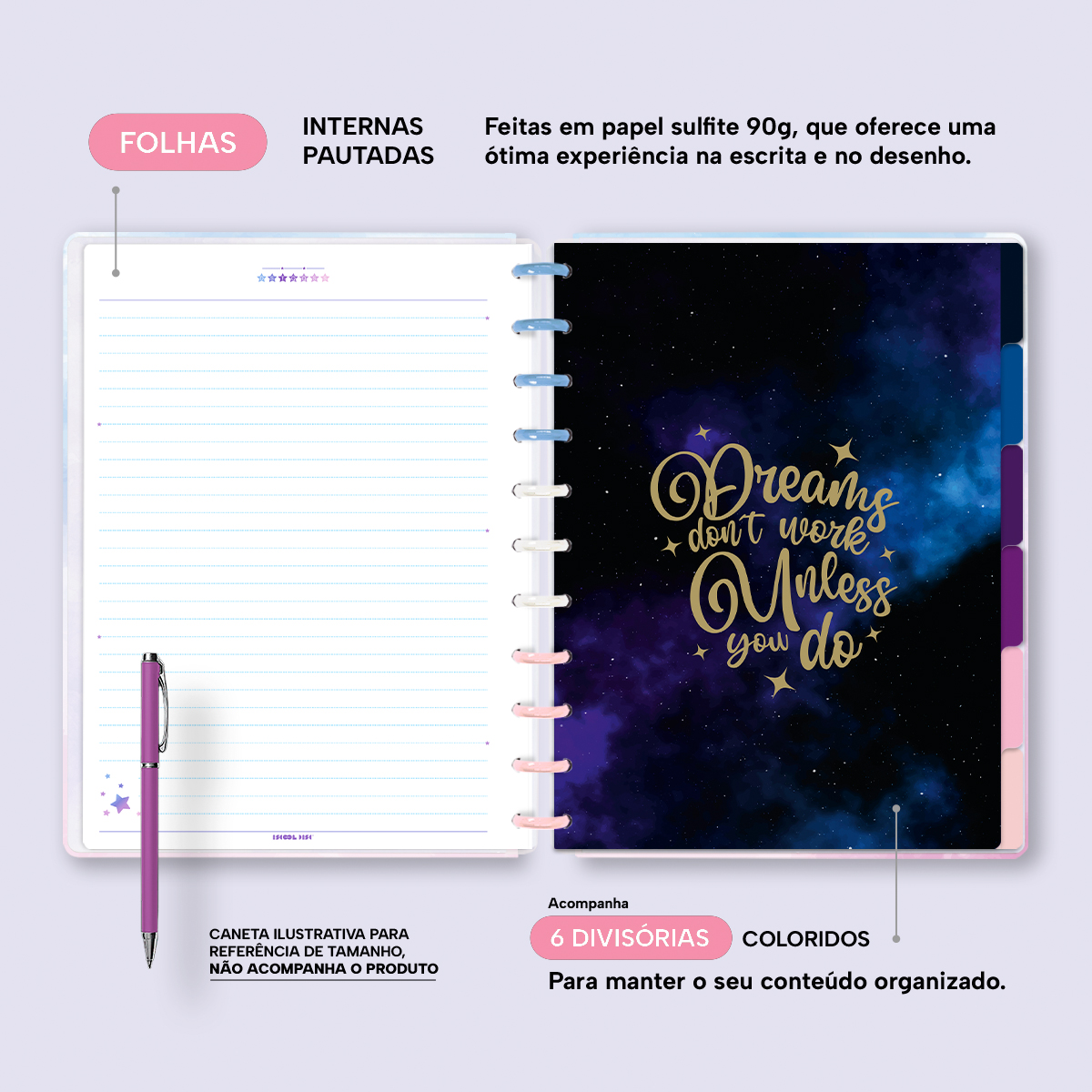 A capa é dura com impressão digital de alta definição, acompanha 6 lindas divisórias que você pode colocar em qualquer local do caderno, funcionando como o guia perfeito para sua organização.