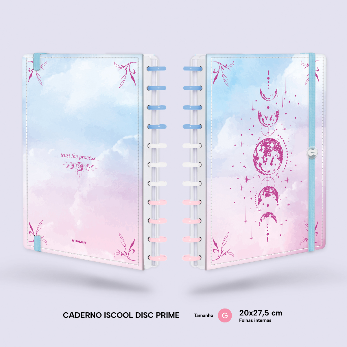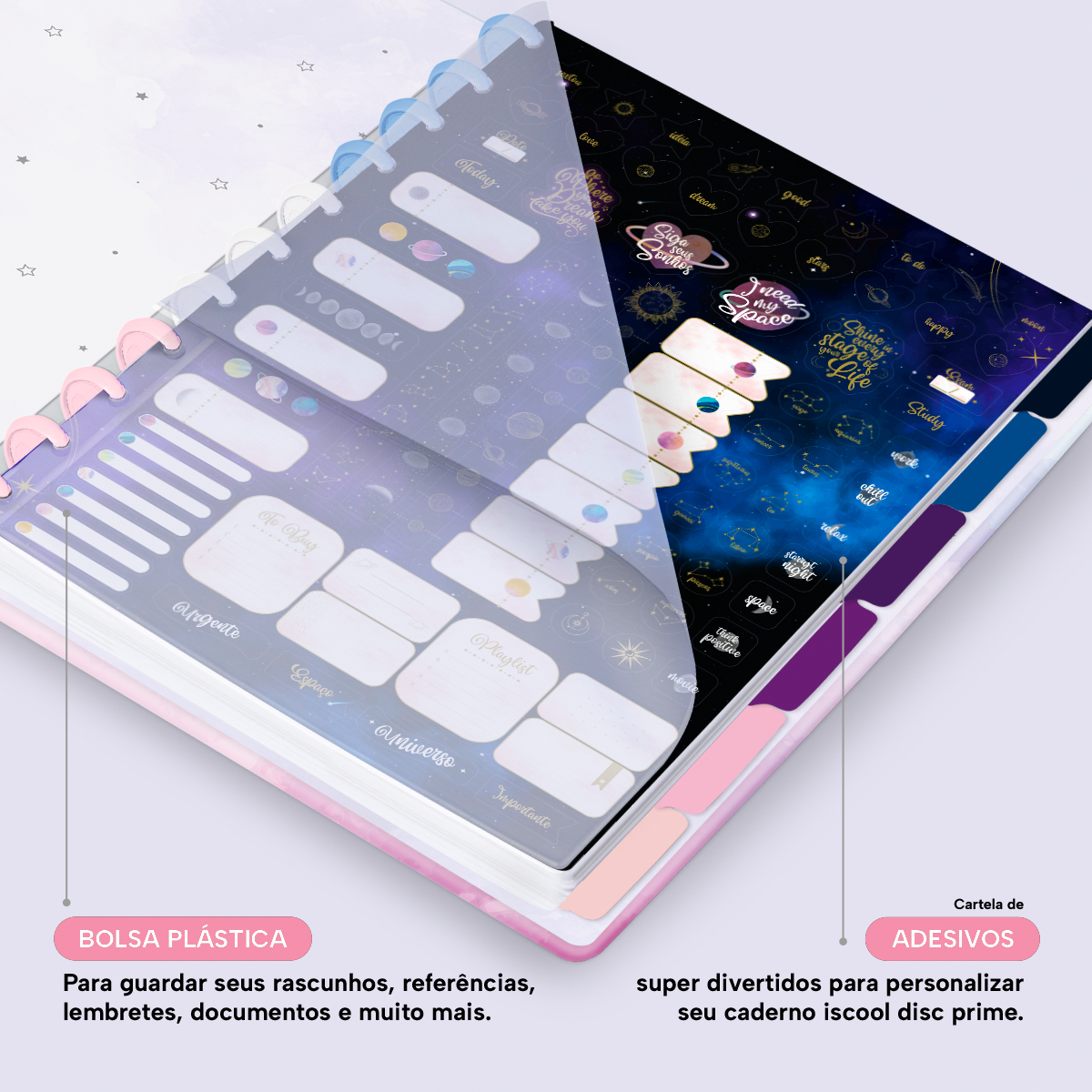 Além de tudo isso, o Iscool Disc Prime, conta com detalhezinhos que fazem toda diferença: elástico para fechamento da capa, muito mais estilo e privacidade para suas anotações; bolsa plástica para guardar seus rascunhos, referências, lembretes, documentos e uma cartela de adesivos incríveis, para que você possa personalizar seu caderno do seu jeitinho!