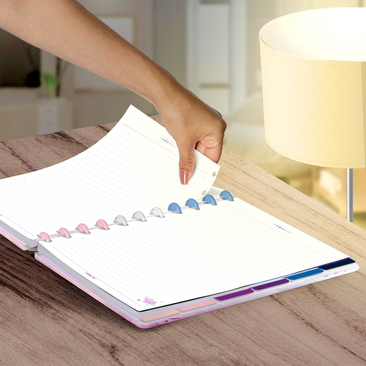 Com furos no formato de “cogumelo”, você poderá dar um “up” em seu caderno com nossos refis, além de ser compatível com outros fabricantes de cadernos de discos.