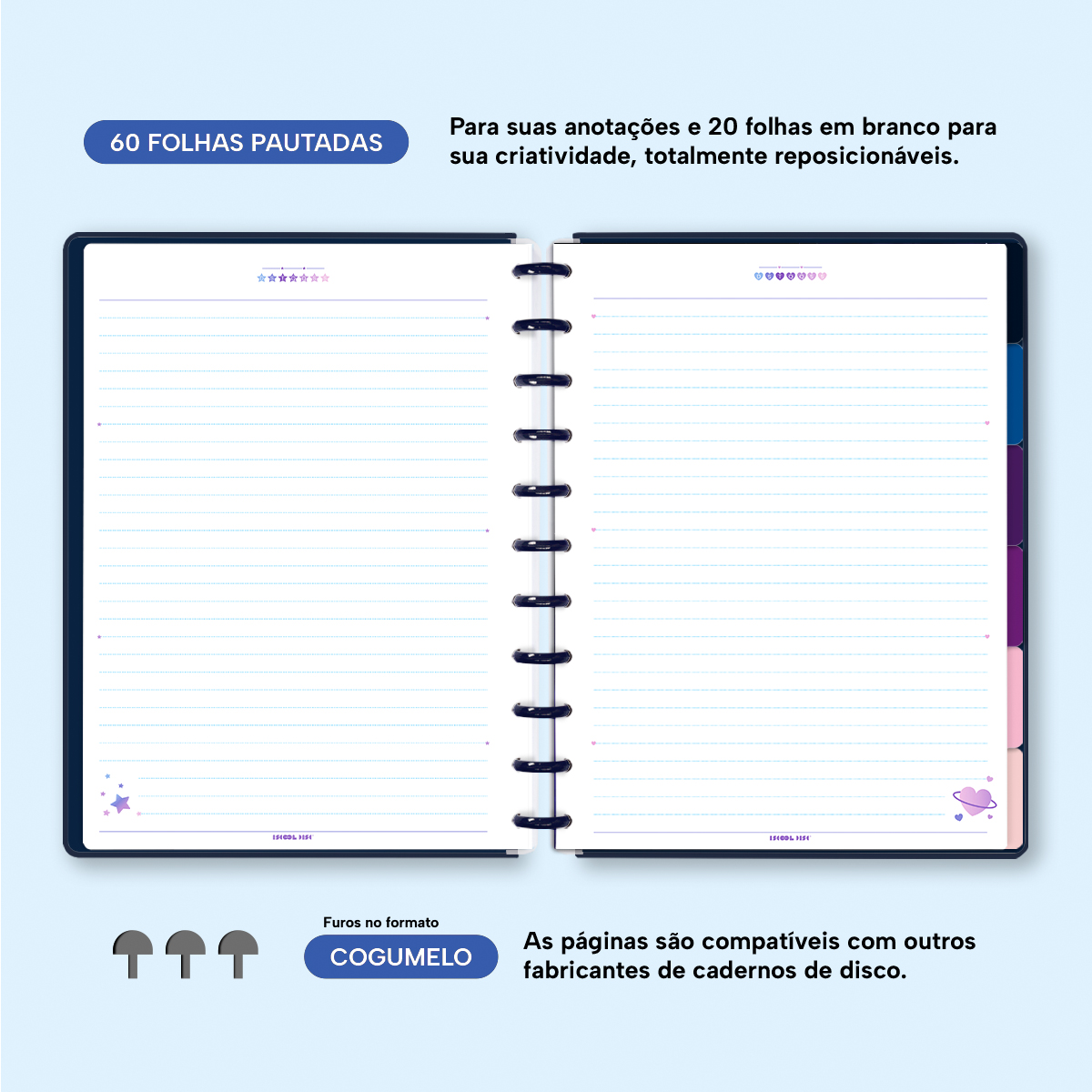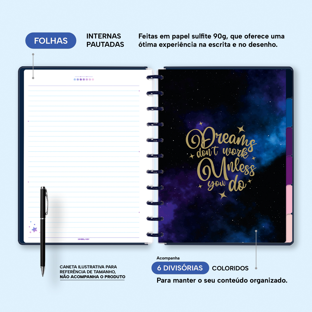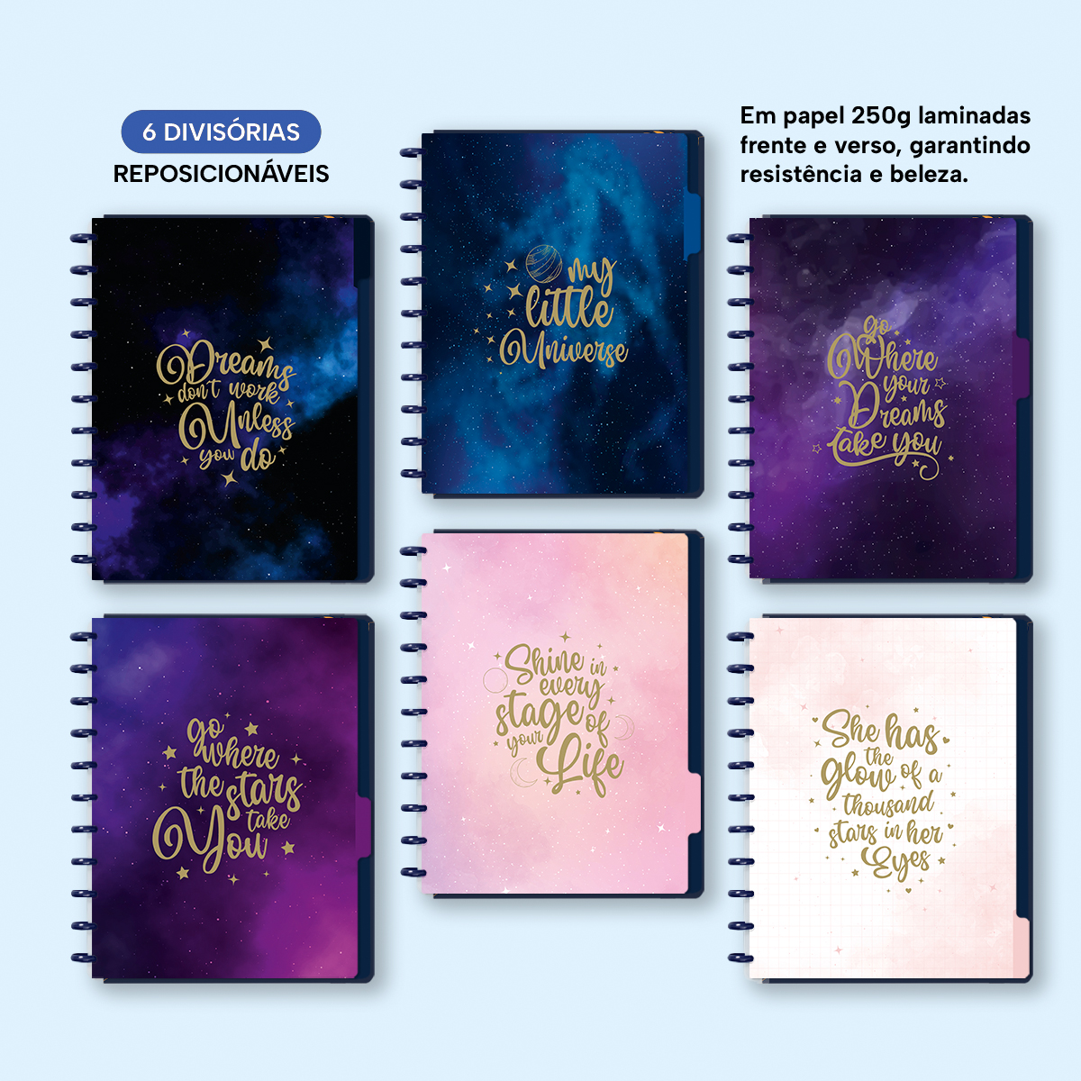 A capa é dura com impressão digital de alta definição, acompanha 6 lindas divisórias que você pode colocar em qualquer local do caderno, funcionando como o guia perfeito para sua organização.
