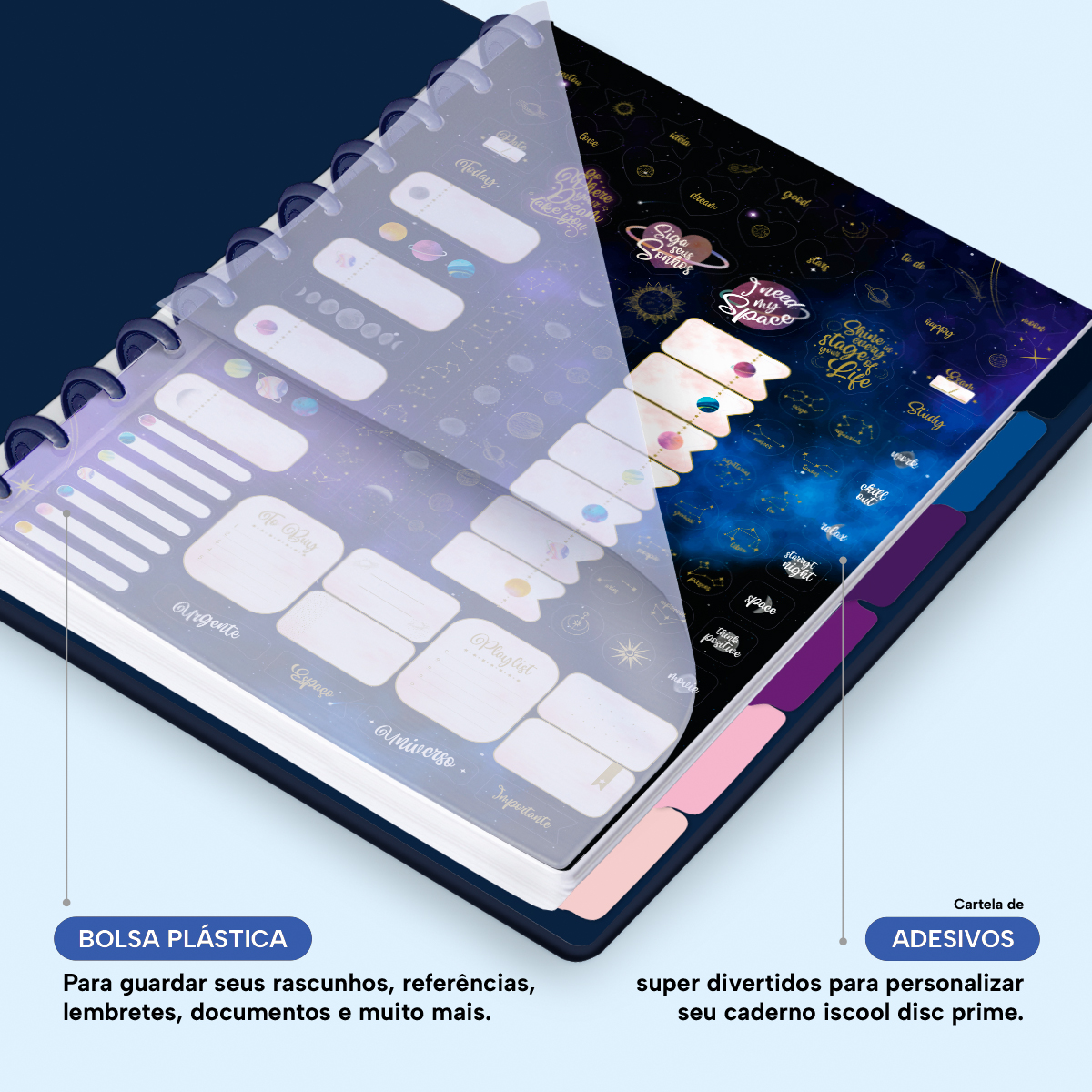 Além de tudo isso, o Iscool Disc Prime, conta com detalhezinhos que fazem toda diferença: elástico para fechamento da capa, muito mais estilo e privacidade para suas anotações; bolsa plástica para guardar seus rascunhos, referências, lembretes, documentos e uma cartela de adesivos incríveis, para que você possa personalizar seu caderno do seu jeitinho!