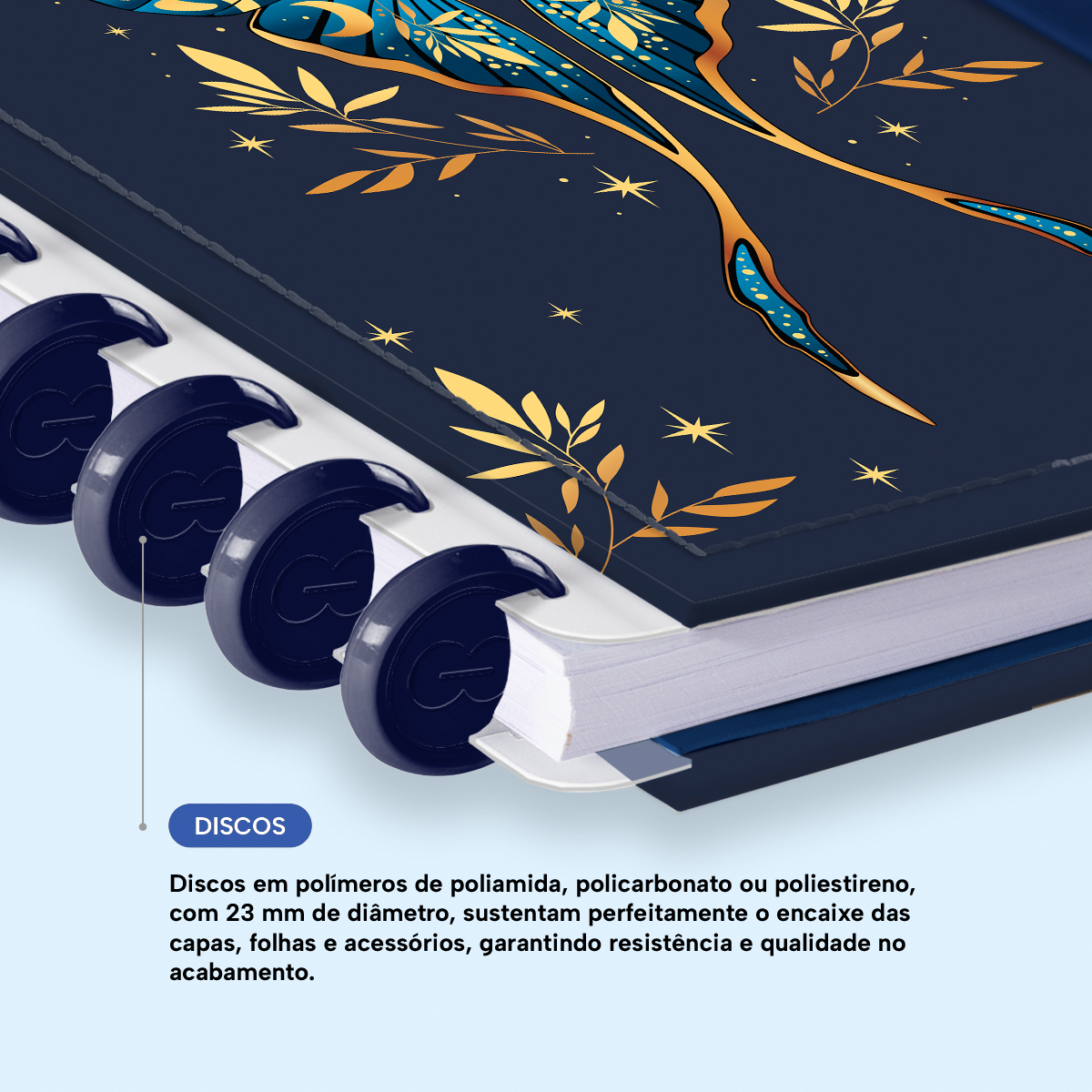 Encadernado com 11 discos M de 23mm em polímero de nylon e/ou policarbonato coloridos, fabricados no Brasil.