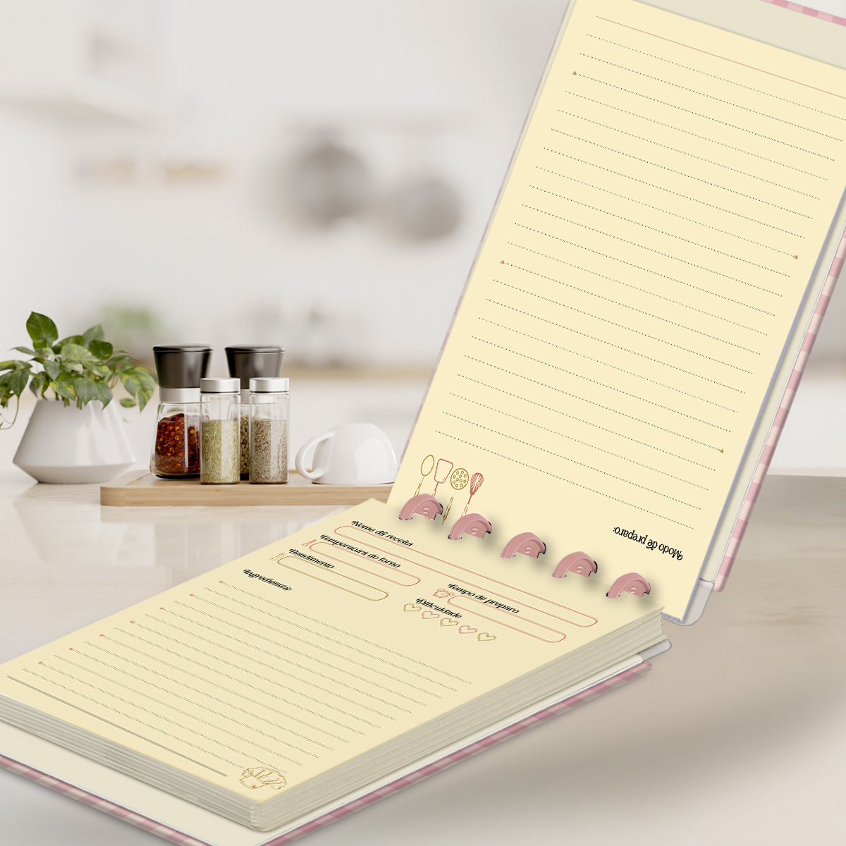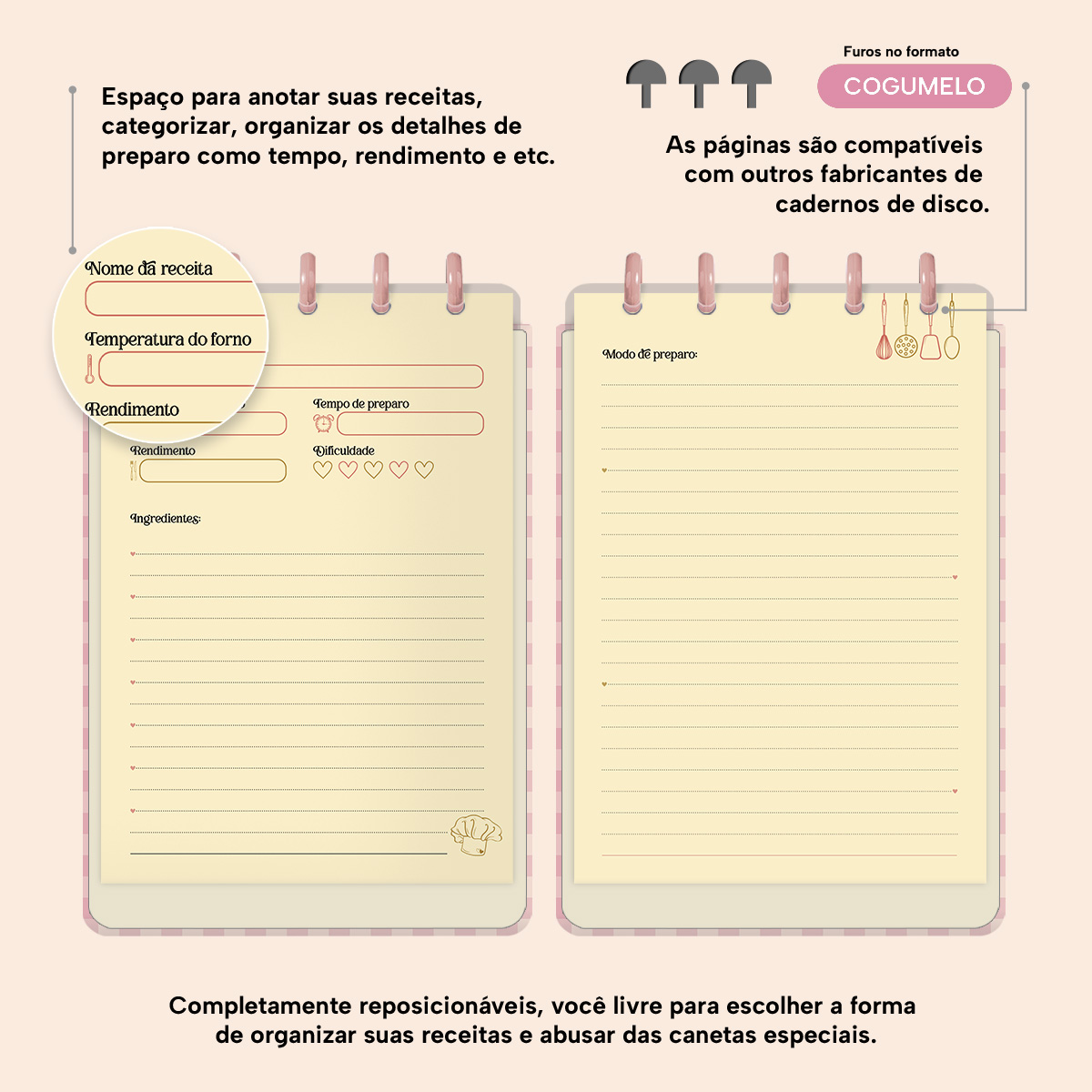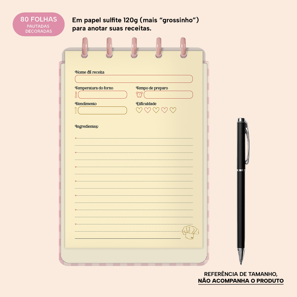 Nele, você conta com páginas para descrever cada receita, onde poderá anotar: o nome da receita, a temperatura do forno, o rendimento, o tempo de preparo, a dificuldade, os ingredientes e ainda o modo de preparo.