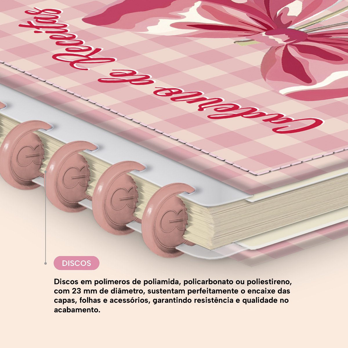 Encadernado com 5 discos M de 23 mm fabricados em polímeros de poliamida, policarbonato ou poliestireno.