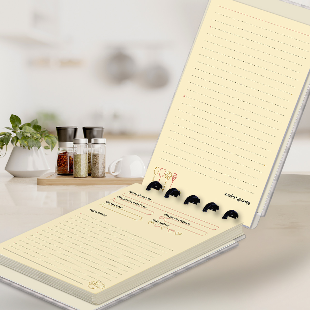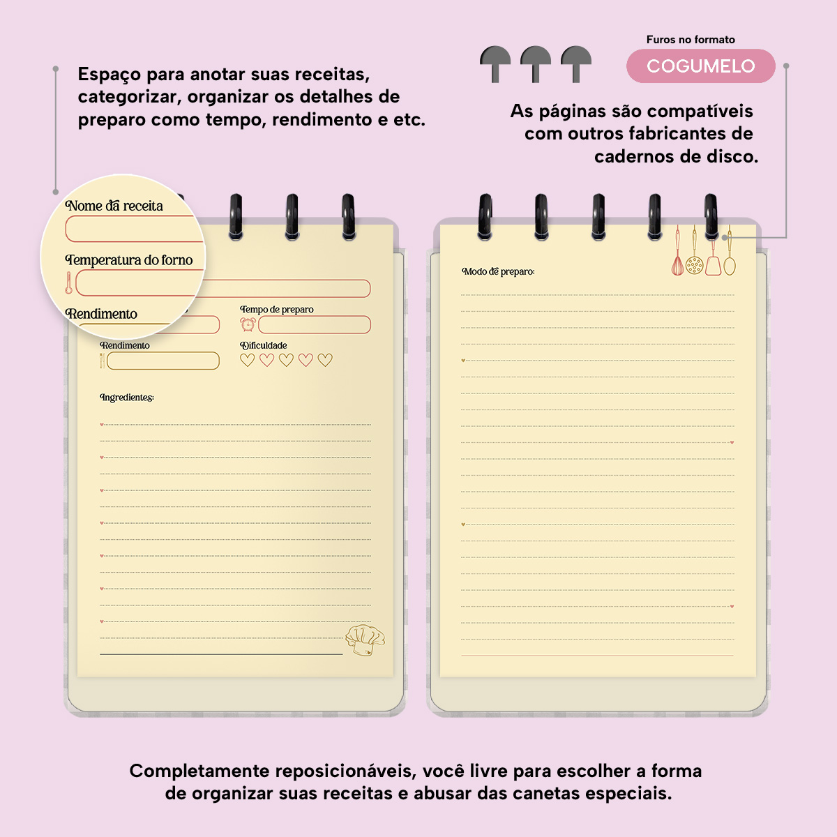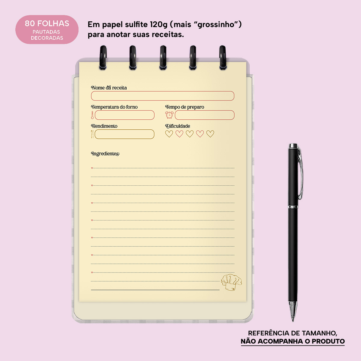 Nele, você conta com páginas para descrever cada receita, onde poderá anotar: o nome da receita, a temperatura do forno, o rendimento, o tempo de preparo, a dificuldade, os ingredientes e ainda o modo de preparo.