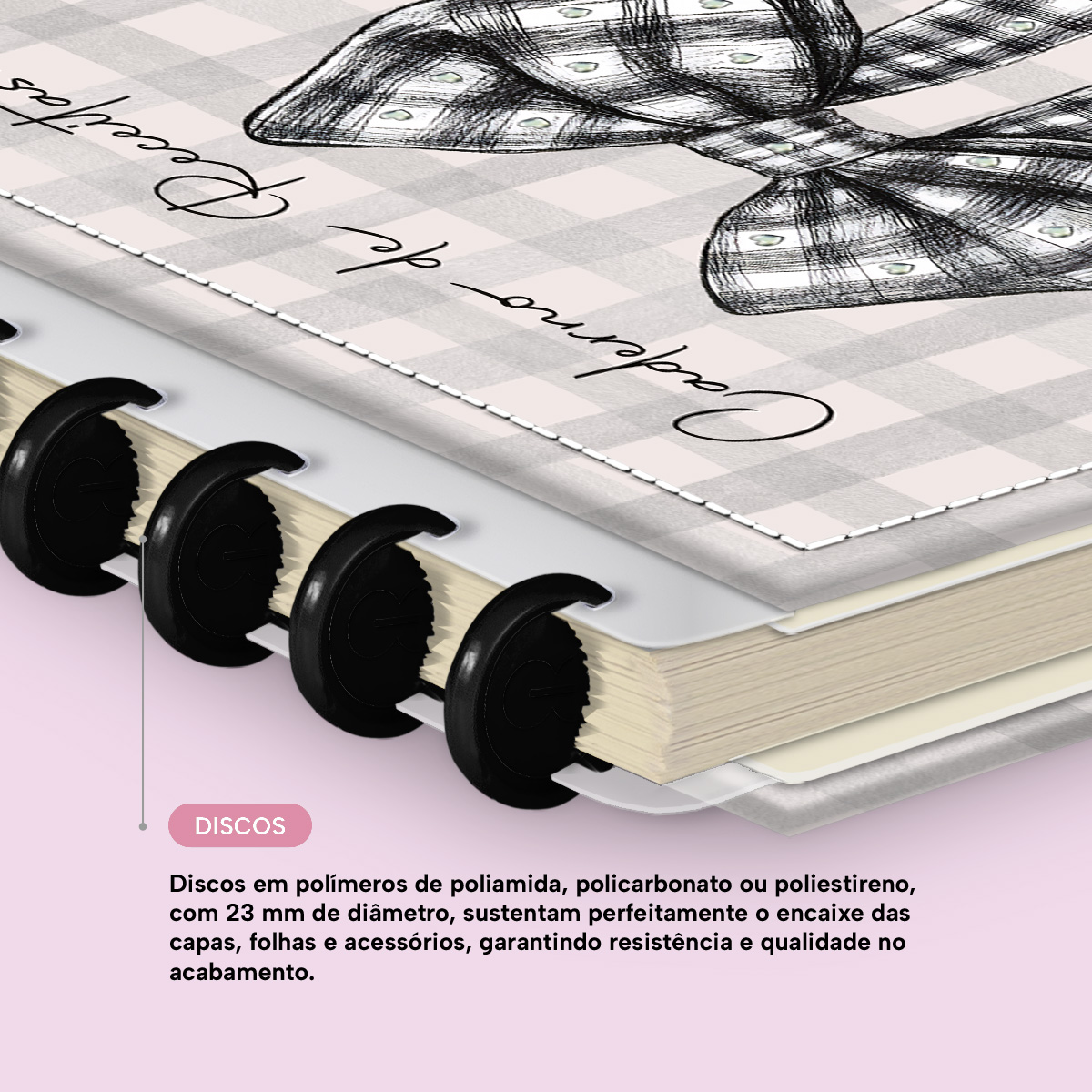 É um caderno totalmente customizável, no qual os elementos são reposicionáveis. Você pode montá-lo como preferir, deixando sua criatividade fluir livremente. Os nossos discos podem ser substituídos, proporcionando uma imensa variedade na combinação das cores, qualidade no acabamento e eficácia no encaixe das capas, folhas e acessórios.