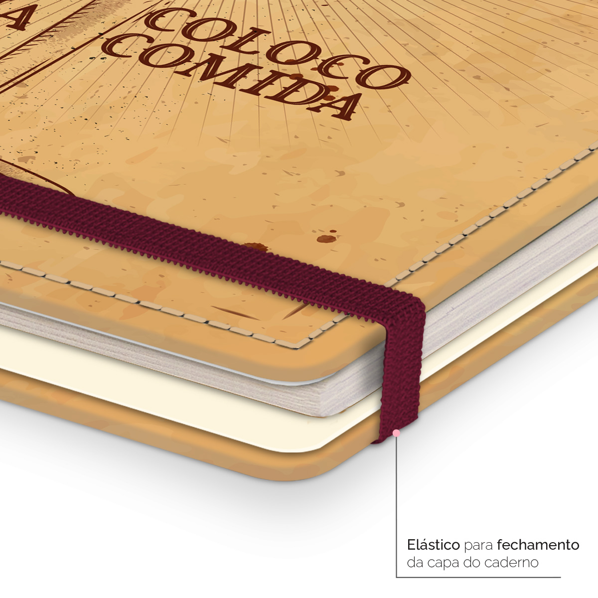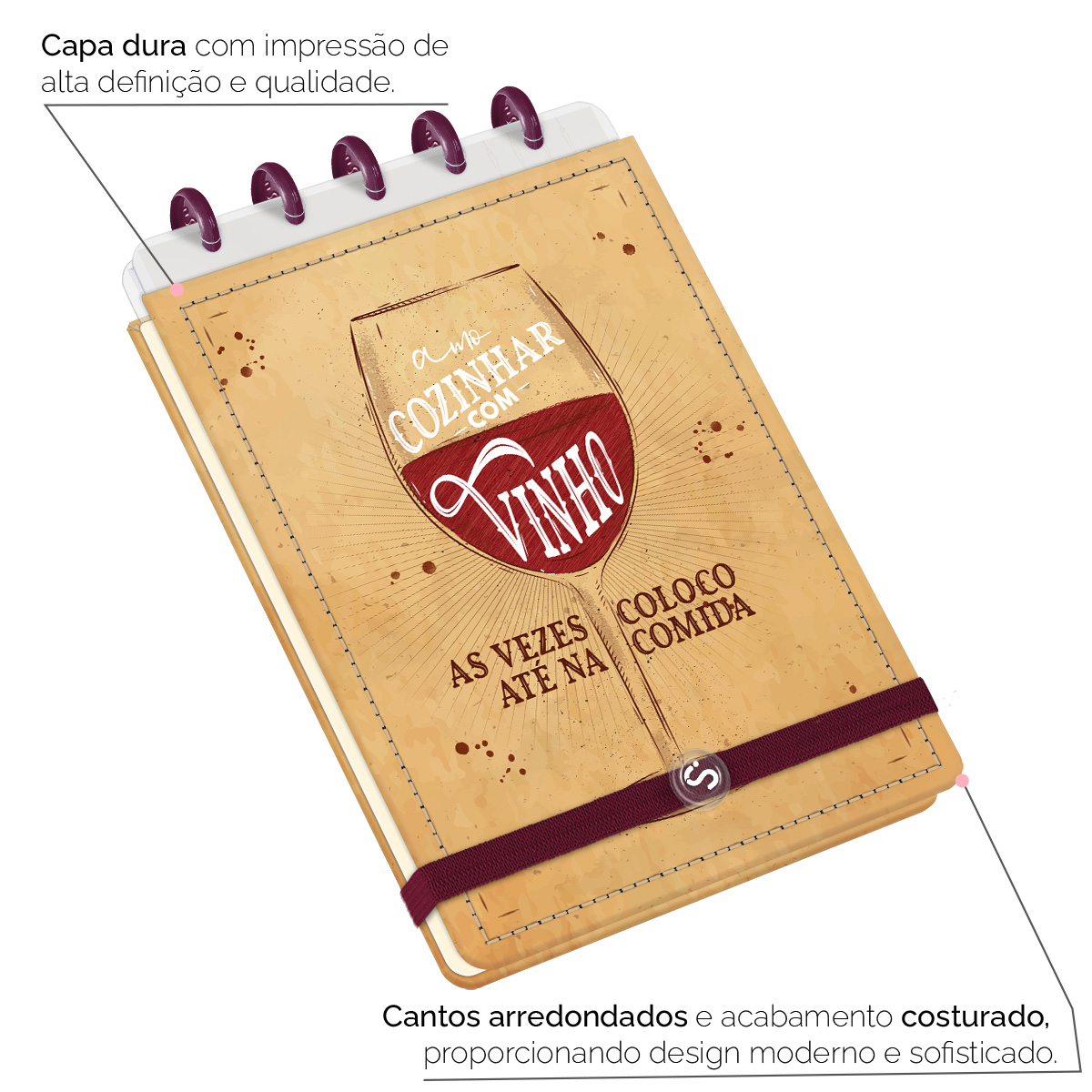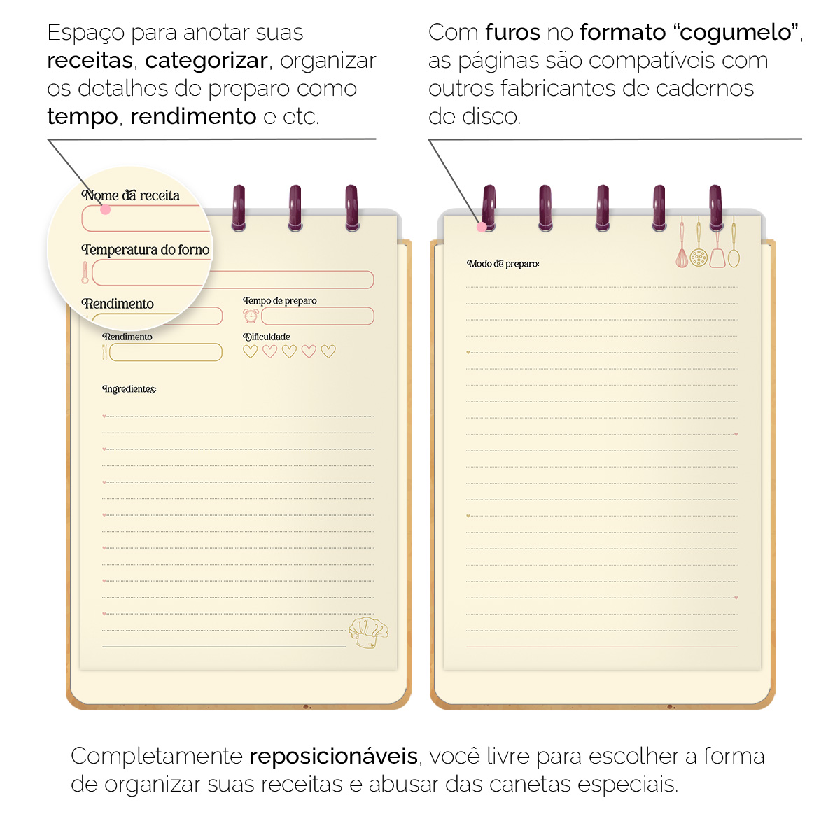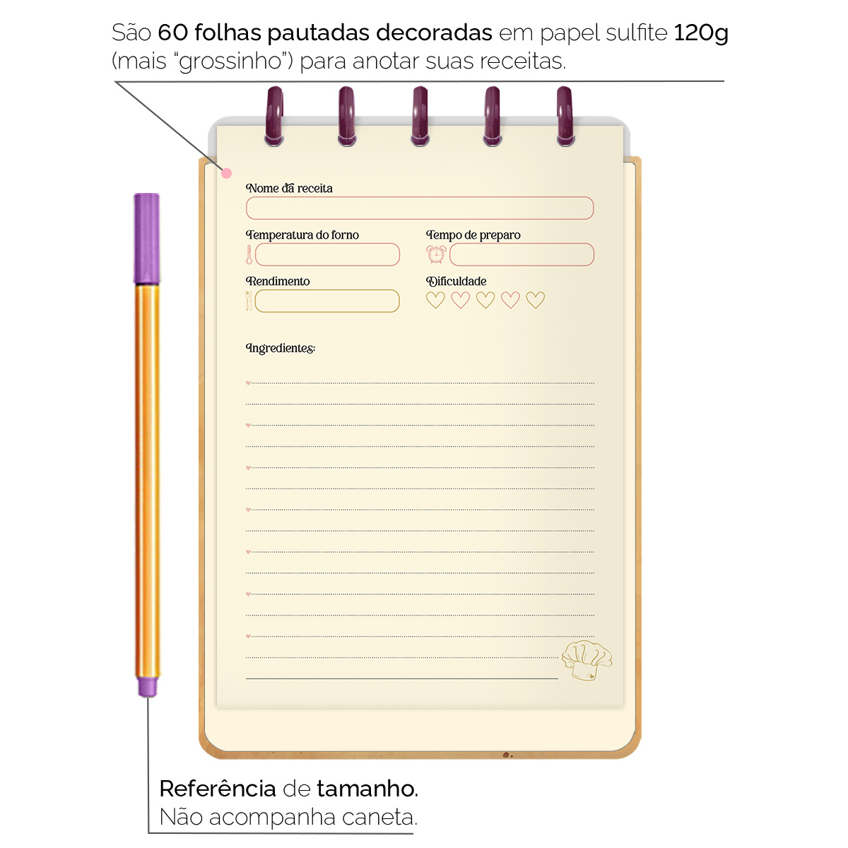 Nele, você conta com páginas para descrever cada receita, onde poderá anotar: o nome da receita, a temperatura do forno, o rendimento, o tempo de preparo, a dificuldade, os ingredientes e ainda o modo de preparo.