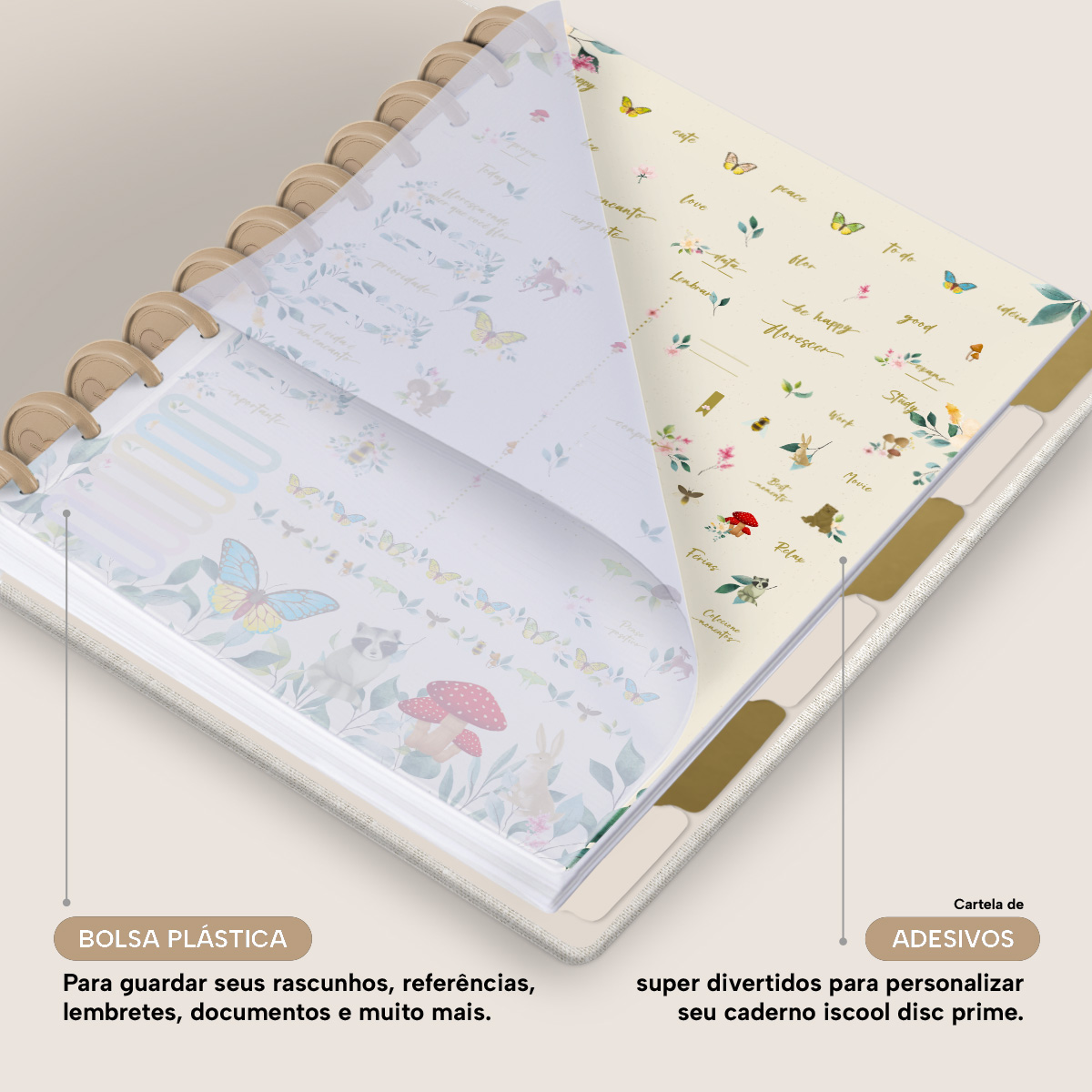 Além de tudo isso, o Iscool Disc Prime, conta com detalhezinhos que fazem toda diferença: elástico para fechamento da capa, muito mais estilo e privacidade para suas anotações; bolsa plástica para guardar seus rascunhos, referências, lembretes, documentos e uma cartela de adesivos incríveis, para que você possa personalizar seu caderno do seu jeitinho!