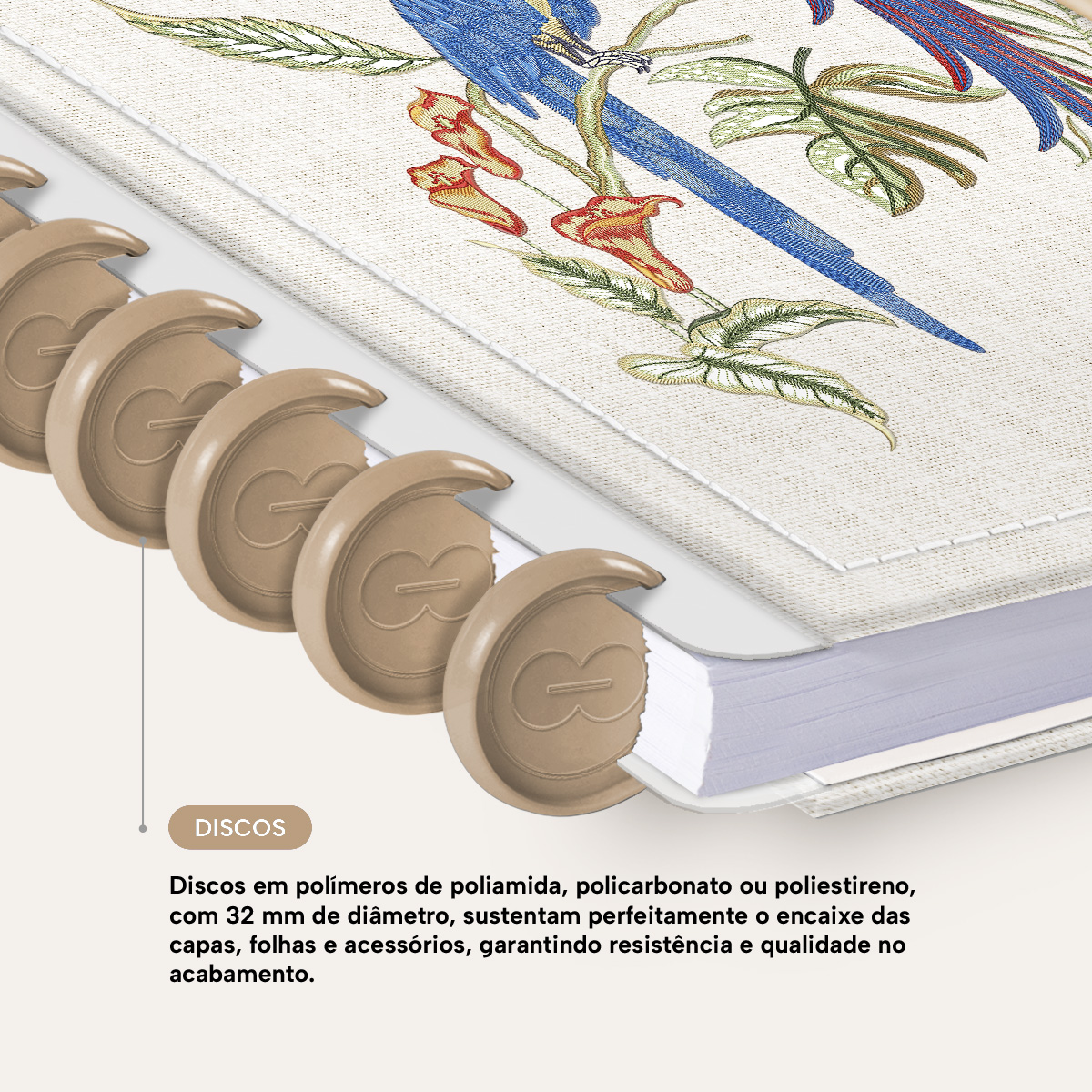 Encadernado com 11 discos M de 23mm em polímero de nylon e/ou policarbonato coloridos, fabricados no Brasil.