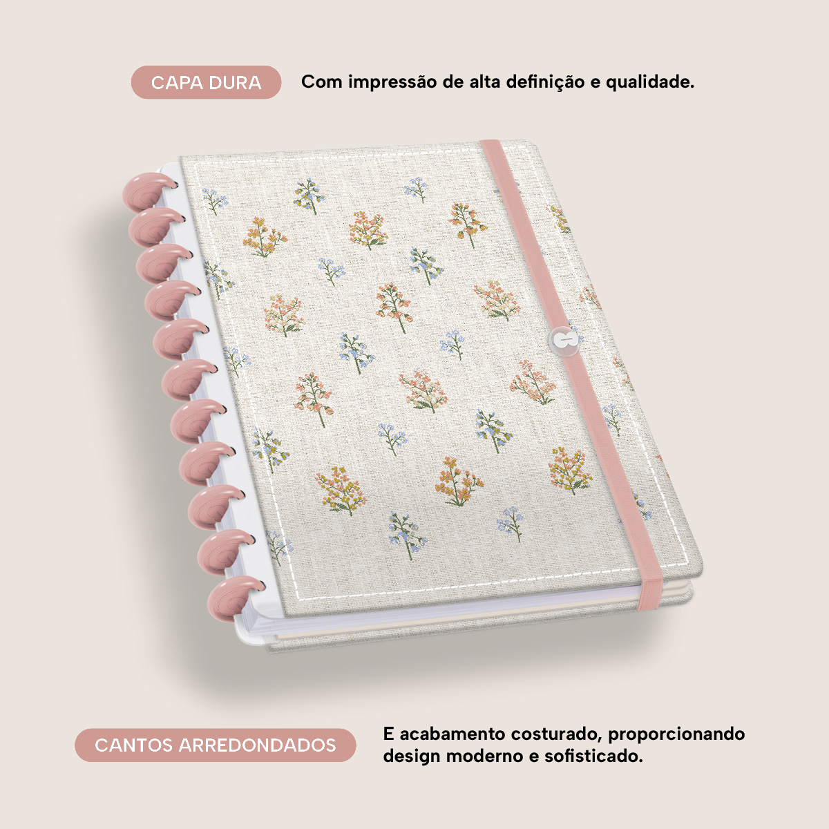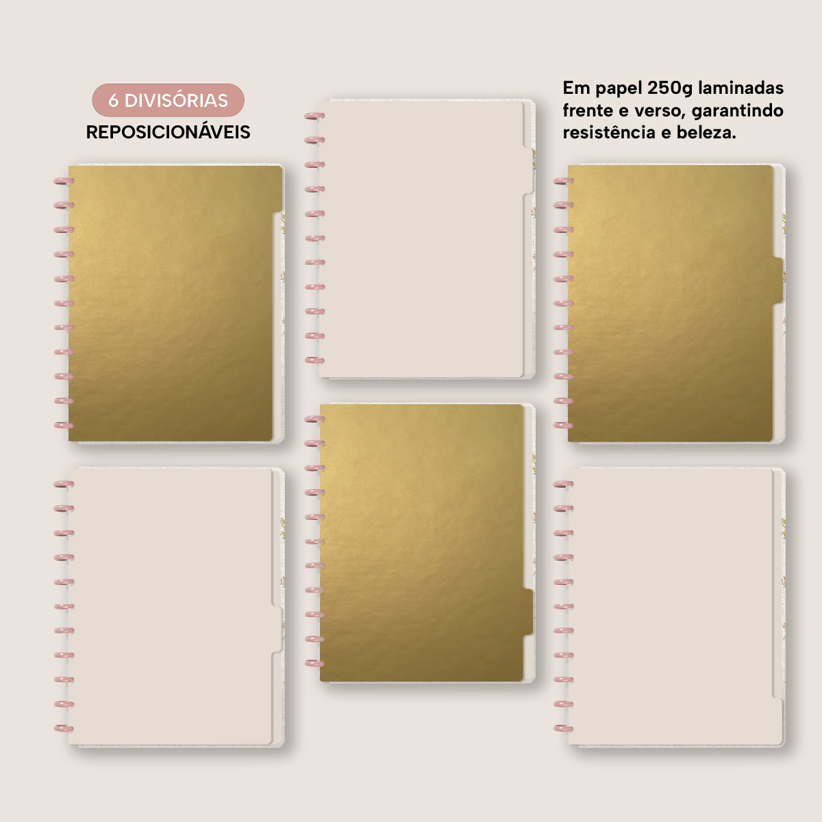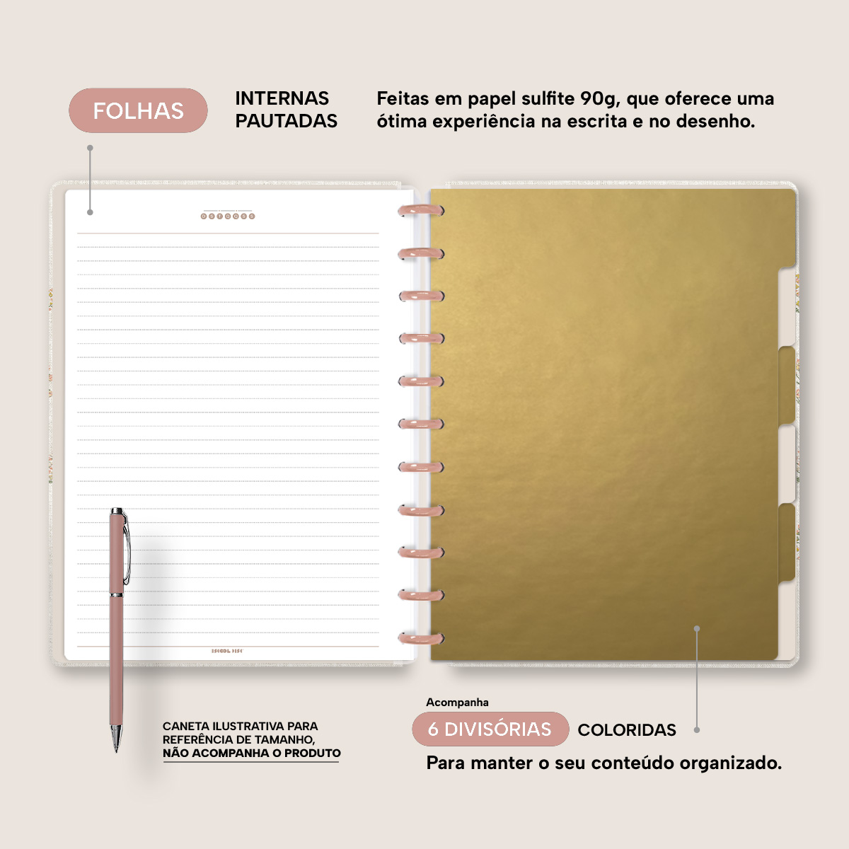 A capa é dura com impressão digital de alta definição, acompanha 6 lindas divisórias que você pode colocar em qualquer local do caderno, funcionando como o guia perfeito para sua organização.