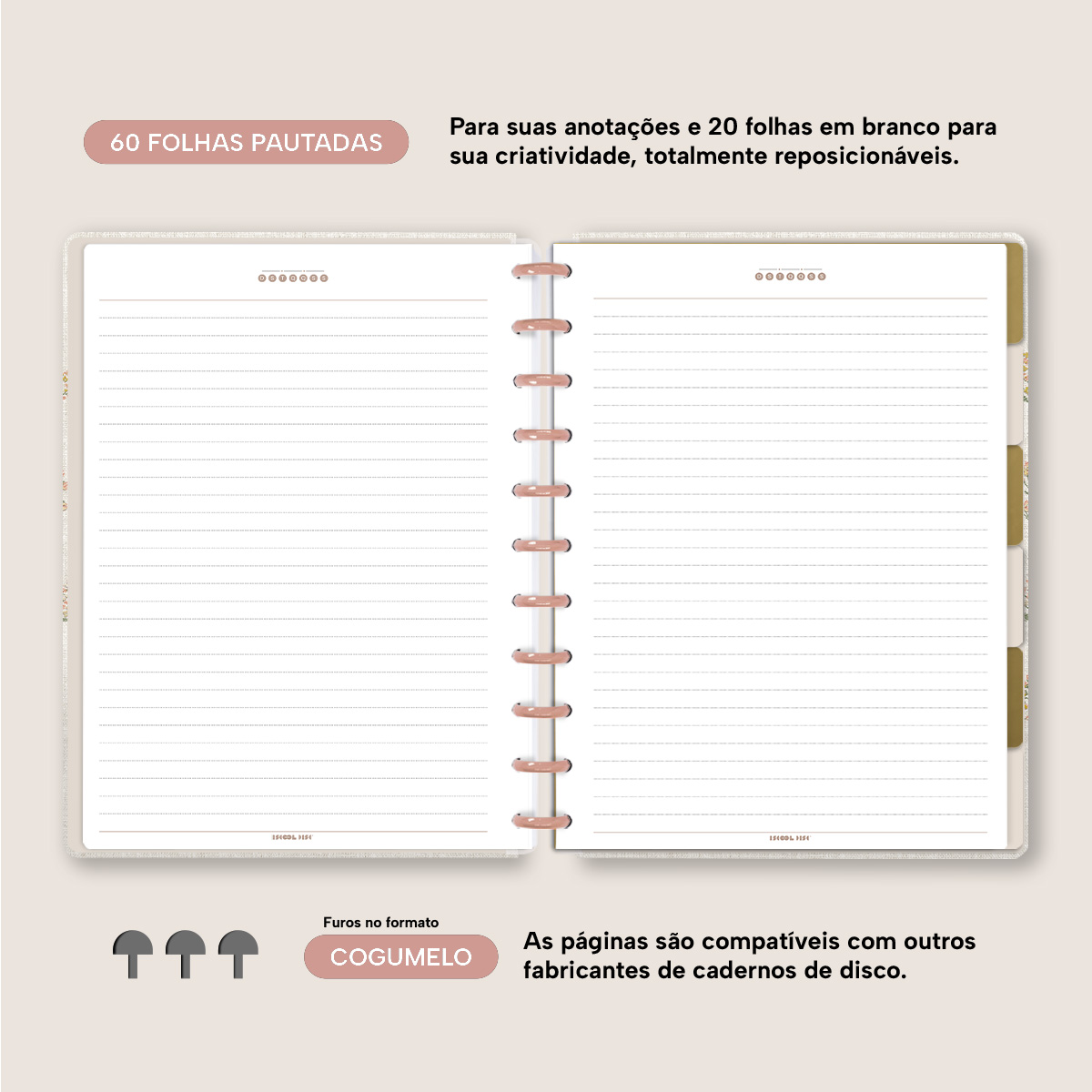 Com furos no formato de “cogumelo”, você poderá dar um “up” em seu caderno com nossos refis, além de ser compatível com outros fabricantes de cadernos de discos.