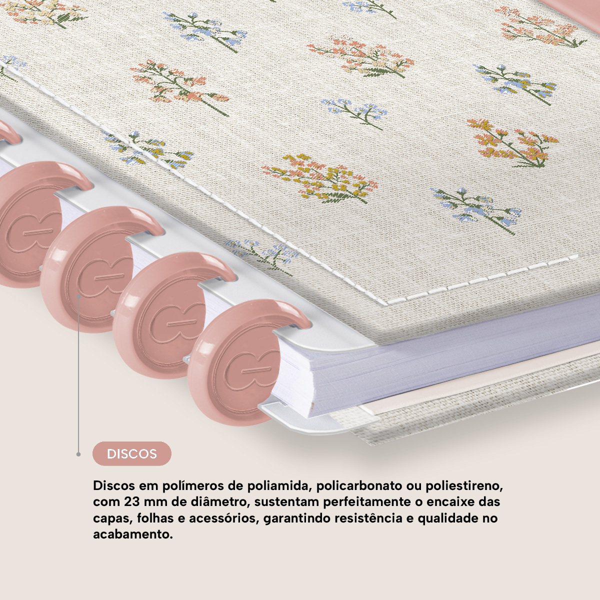 Os nossos discos são fabricados em polímero de nylon e/ou policarbonato, podem ser substituídos, proporcionando imensa variedade na combinação das cores, qualidade no acabamento e eficácia no encaixe das capas, folhas e acessórios.