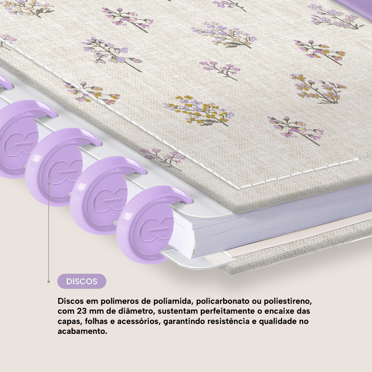 Encadernado com 11 discos M de 23mm em polímero de nylon e/ou policarbonato coloridos, fabricados no Brasil.