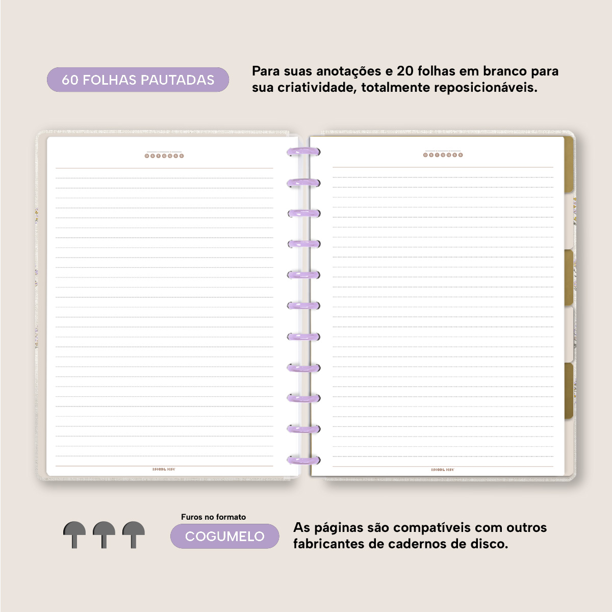 A capa é dura com impressão digital de alta definição, acompanha 6 lindas divisórias que você pode colocar em qualquer local do caderno, funcionando como o guia perfeito para sua organização.