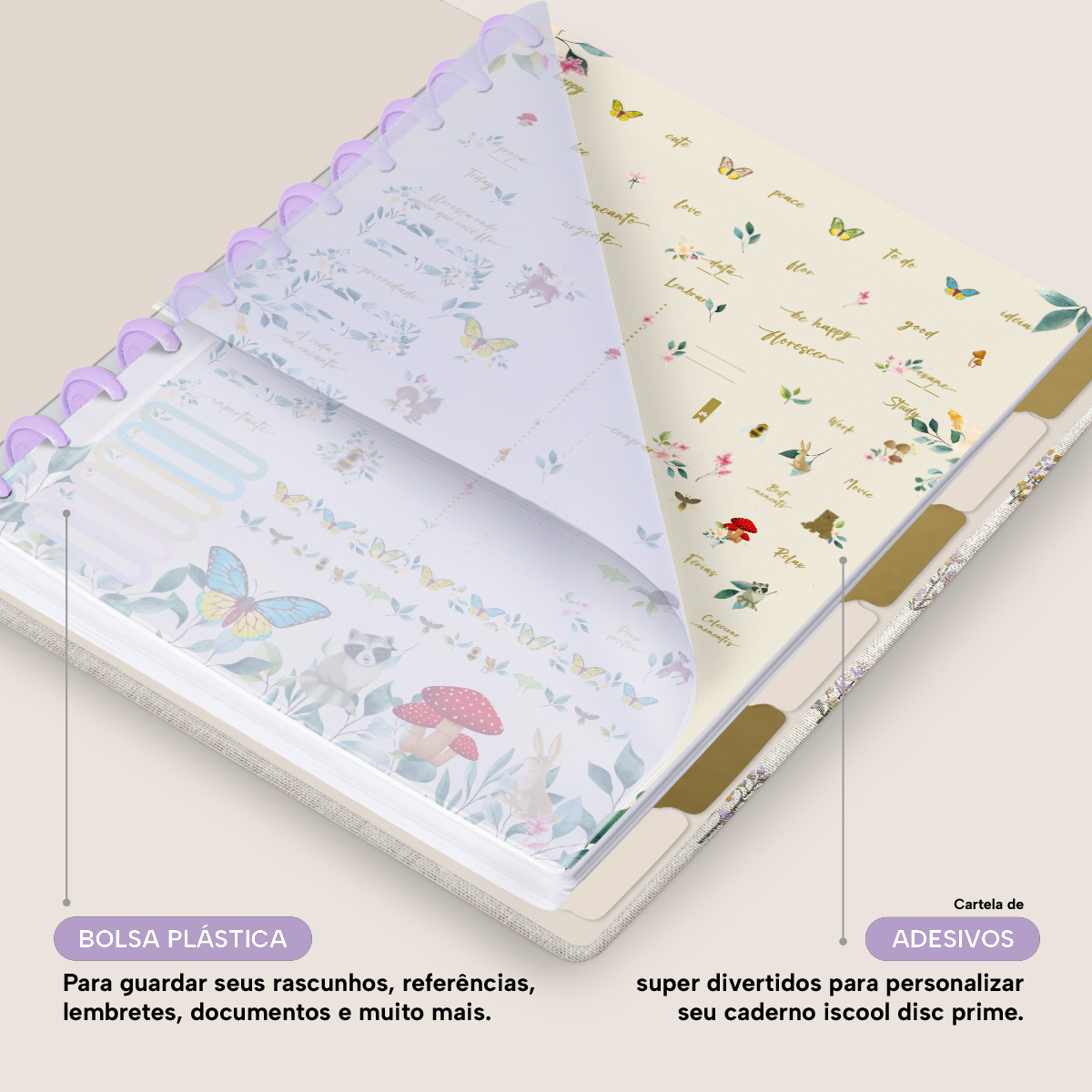 Além de tudo isso, o Iscool Disc Prime, conta com detalhezinhos que fazem toda diferença: elástico para fechamento da capa, muito mais estilo e privacidade para suas anotações; bolsa plástica para guardar seus rascunhos, referências, lembretes, documentos e uma cartela de adesivos incríveis, para que você possa personalizar seu caderno do seu jeitinho!