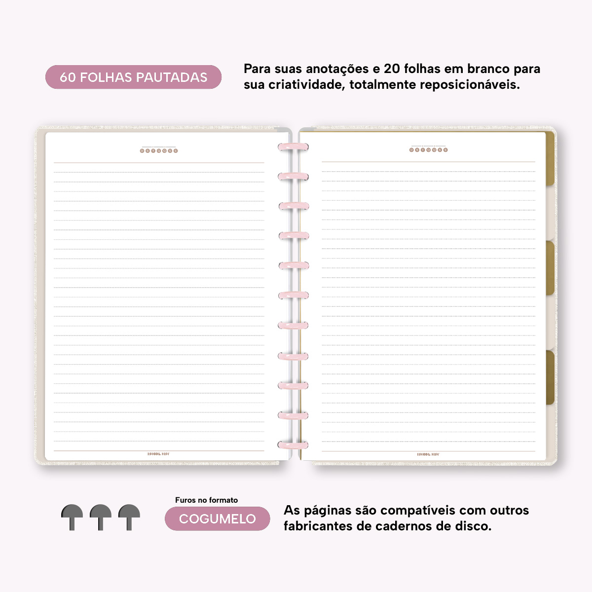 O miolo conta com 60 folhas pautadas decoradas em papel sulfite 90g, (aquele papel mais “grossinho”) para que você use e abuse das suas canetas especiais e 20 folhas em branco, ideais para explorar seu lado mais criativo ou até imprimir nelas.